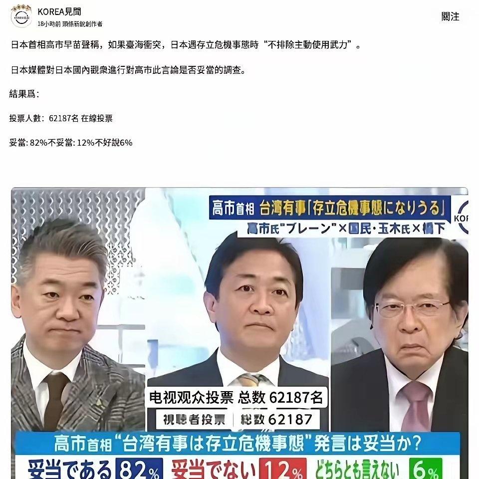 好事啊,日本这是想再次搞中日对决啊!最新民调显示有82%日本民众支持高市早苗的针对台海的言论: 即在台海冲突时,日本遇存立危机事态时"不排除主动使用武力"。 他们忘记联合国敌国条款了,就是中国这些安理会理事国认为战败国有纳粹死灰复燃的情况,可以不通过联合国授权就动武锄灭。 这种情况下,我们可以认为日本再找借口对中国要进攻,那我们随时准备干死他们。想拿回琉球群岛,日本要介入台海那这次是一个好机会