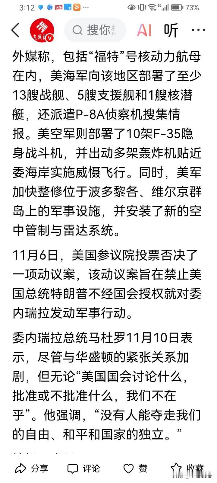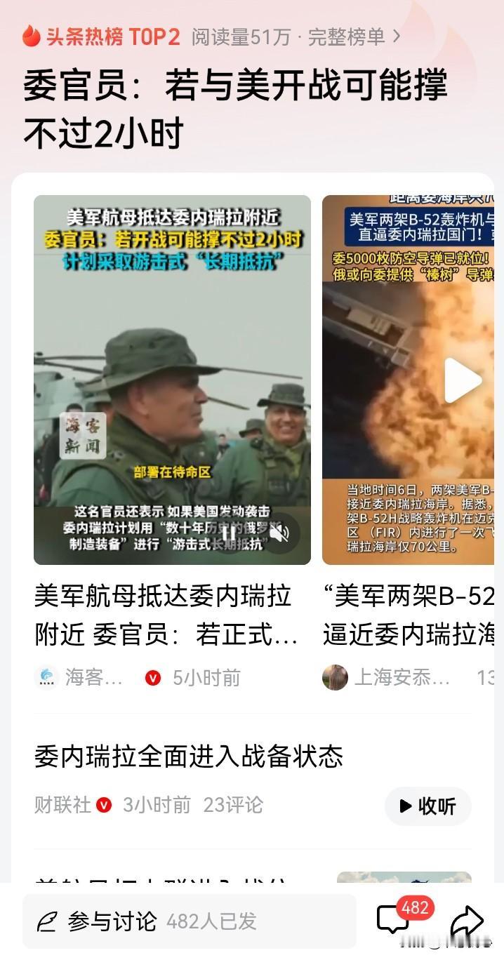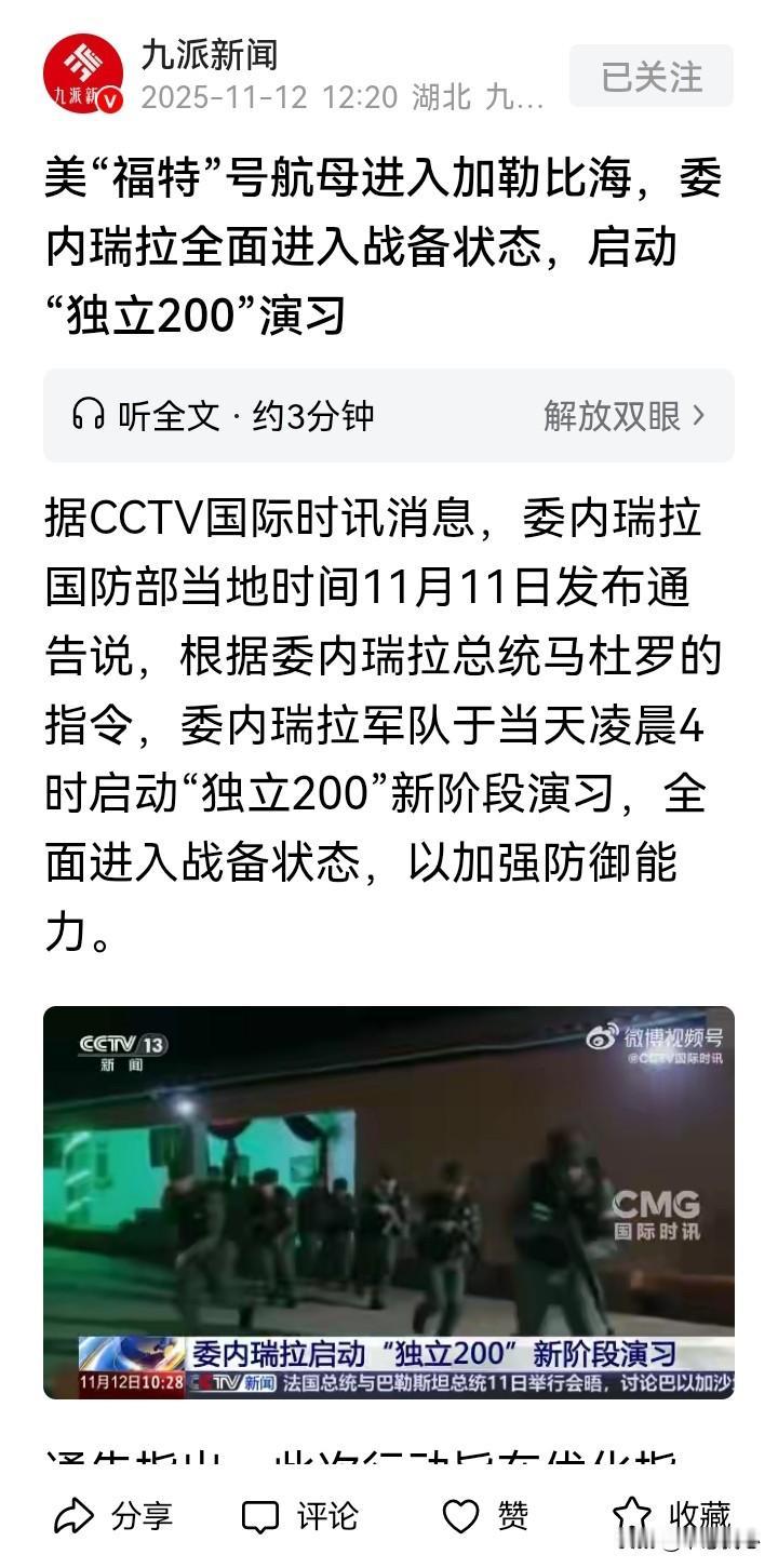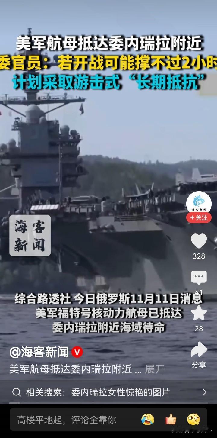 我想过是2天,但没有想过委内瑞拉连抵抗美国入侵2小时都支撑不了,而这是委内瑞拉官员表示的。只是看了后,也没有发现具体是哪个委内瑞拉官员说的话。 说起来,委内瑞拉和美国交恶,也有20多年了吧。之前是查韦斯在台上,查韦斯走后,委内瑞拉到了马杜罗执政。面对美国的制裁以及军事威胁,委内瑞拉应该也做了很长时间的准备了。 而且,委内瑞拉和俄罗斯现在算是军事盟友关系了,俄罗斯已经发了很多防空导弹给委内瑞拉,如果美国真的发动入侵,势必也要付出不小的代价。 只是,在美国这边,6号美国已经否决了一项禁止特朗普不经国会授权就对委内瑞拉动武的动议案,现在美军福特号核动力航母又抵达委内瑞拉附近海域后,给人一种大军集结,箭在弦上不得不发的感觉。 是一劳永逸地真正军事推翻马杜罗,还是一种极限施压,或许只有特朗普自己知道,也或者只有以后的特朗普才知道。 针对美军的集结,委内瑞拉在国内也是做足了准备,现在又开始了“独立200”的新阶段演练,全面进入战备状态,以加强防御。 或许,军事斗争,虚虚实实,“若与美开战可能撑不过2小时”的说法,一方面是故意对美军示弱,另一方面又是对俄罗斯军事盟友的呼吁,加紧发军事装备,最好还派多一些人或舰艇过来……