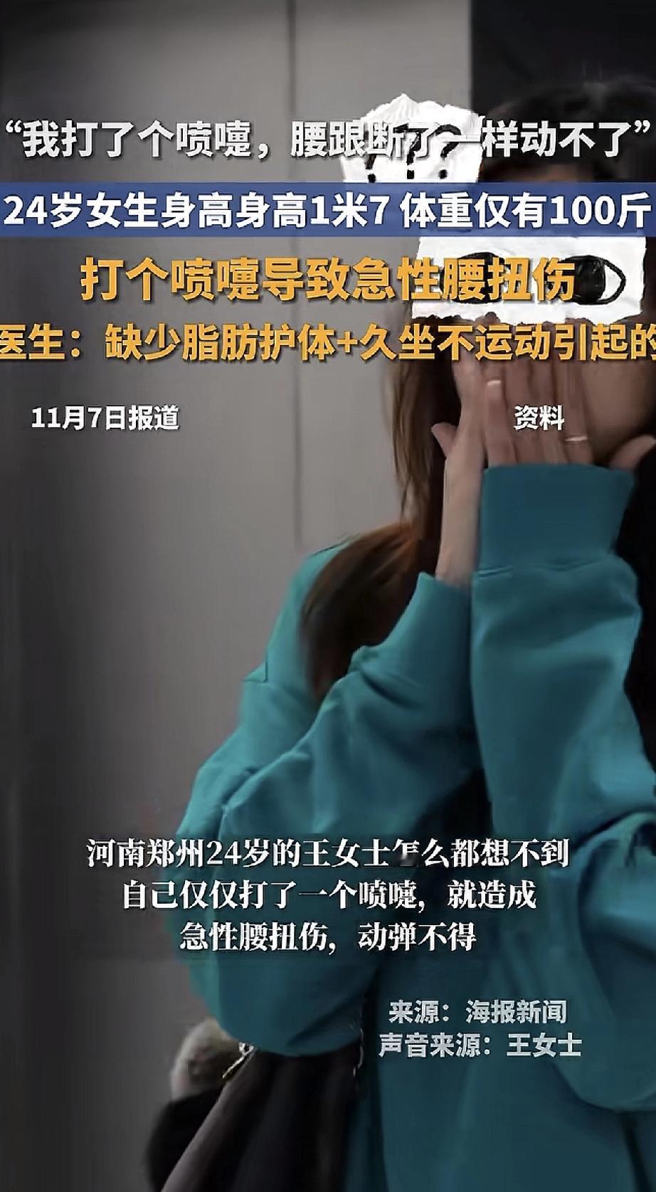 给减肥的人看看!郑州一个24岁的姑娘,身高1米7,体重却只有100斤。她就打了个喷嚏,结果腰“嘎嘣”一声——当场动不了了。 送到医院一查,是急性腰扭伤。医生说,这主要是因为太瘦了,腰部缺少脂肪保护,再加上长期久坐不运动,肌肉力量不够。 这下可好,一个喷嚏代价这么大。提醒瘦瘦的“久坐族”们:光瘦不行,还得适当锻炼,给腰一点支撑力。健康才是真的美!