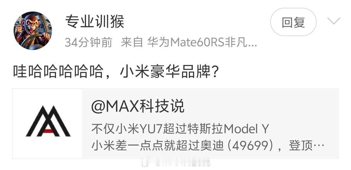 一说小米汽车已经是豪华品牌,有些人就受不了了5月小米成交均价,已经超过了奥迪 特斯拉,现在YU7成为销量主力,均价肯定会继续提升BBA走量的34C,Q5L、X3、GLC,现在实际价格都大幅度下降,还看指导价没意义所以,如果不认可BBA还是豪华品牌,那不认可小米就没问题,否则……