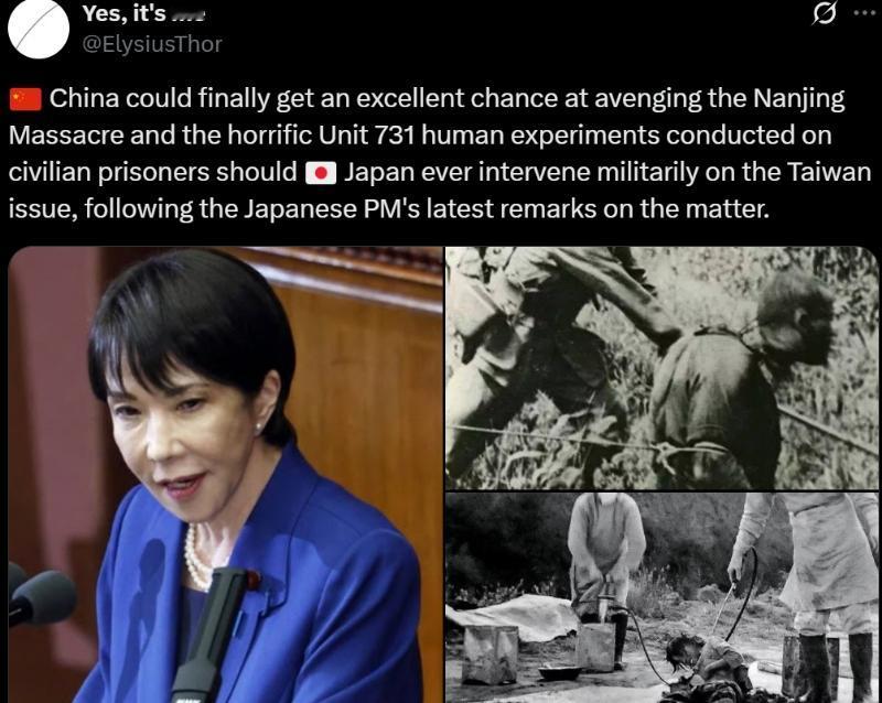 日本首相只不过挑明了中日由来已久的敌对关系 BBC本月11日发表《高市早苗的言论为何引发如此轩然大波》一文认为,高市的言论标志着日本一改其在台湾问题上一贯的模棱两可立场。 中日两国之间存在着由来已久的敌对关系,可以追溯到19世纪的一系列武装冲突及二战期间日本对中国的残酷军事侵略。 历史遗留矛盾一直是中日关系的痛点,安倍晋三亲信高市早苗的崛起,预示未来两国关系将更加紧张。 高市早苗以对华强硬立场和长期支持台湾而闻名。她曾表示,封锁台湾可能威胁日本,日本可能动员军队阻止中国行动。 11月7日,高市早苗在日本众议院预算委员会谈到台湾问题时称,如果涉及使用军舰和武力,那么无论从哪个角度来看,都可能构成威胁日本生存的局面。 11月10日,高市早苗向众议院预算委员会表示,她之前的言论是基于“最坏情况”的假设,无意收回之前的言论,并表示这些言论不代表政府长期以来的立场有任何改变。 朝日新闻称,“生存威胁”是指对与日本关系密切的国家发动攻击,威胁到日本的生存,并对日本人民的生命构成明显危险,即使日本本身并未直接受到攻击。这是日本行使集体自卫权的法律前提。 不少网友认为,根据高市的言论,如果日本真的对台湾问题进行军事干预,中国将终于有机会为南京大屠杀和731部队的罪行进行复仇。 根据联合国宪章中与“敌对国家”有关的关键条款(第 53、77、107 条),如果日本复兴军国主义或威胁和平,授权盟国(包括中国)对日本采取强制措施——包括军事行动。