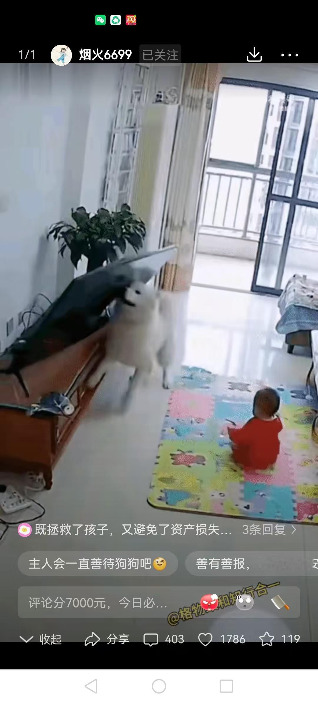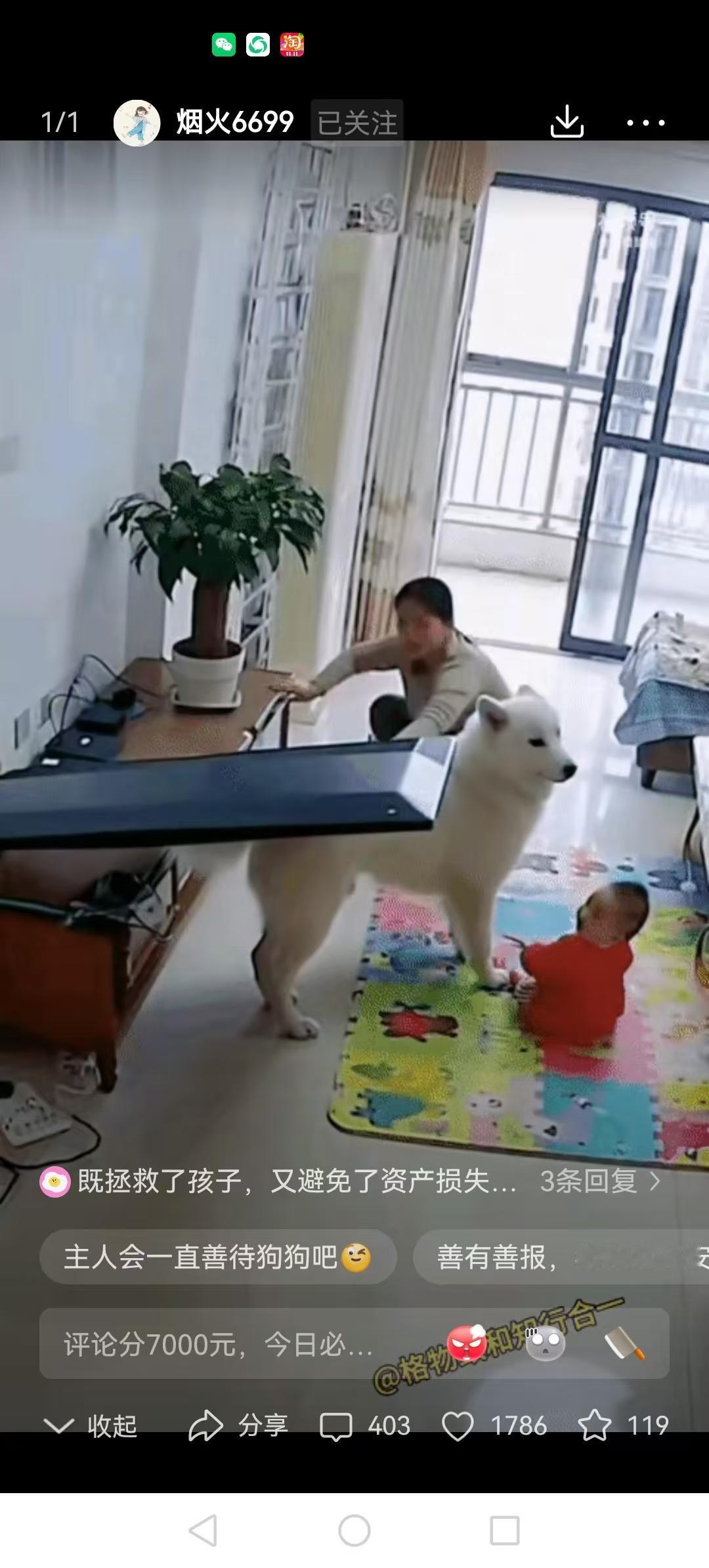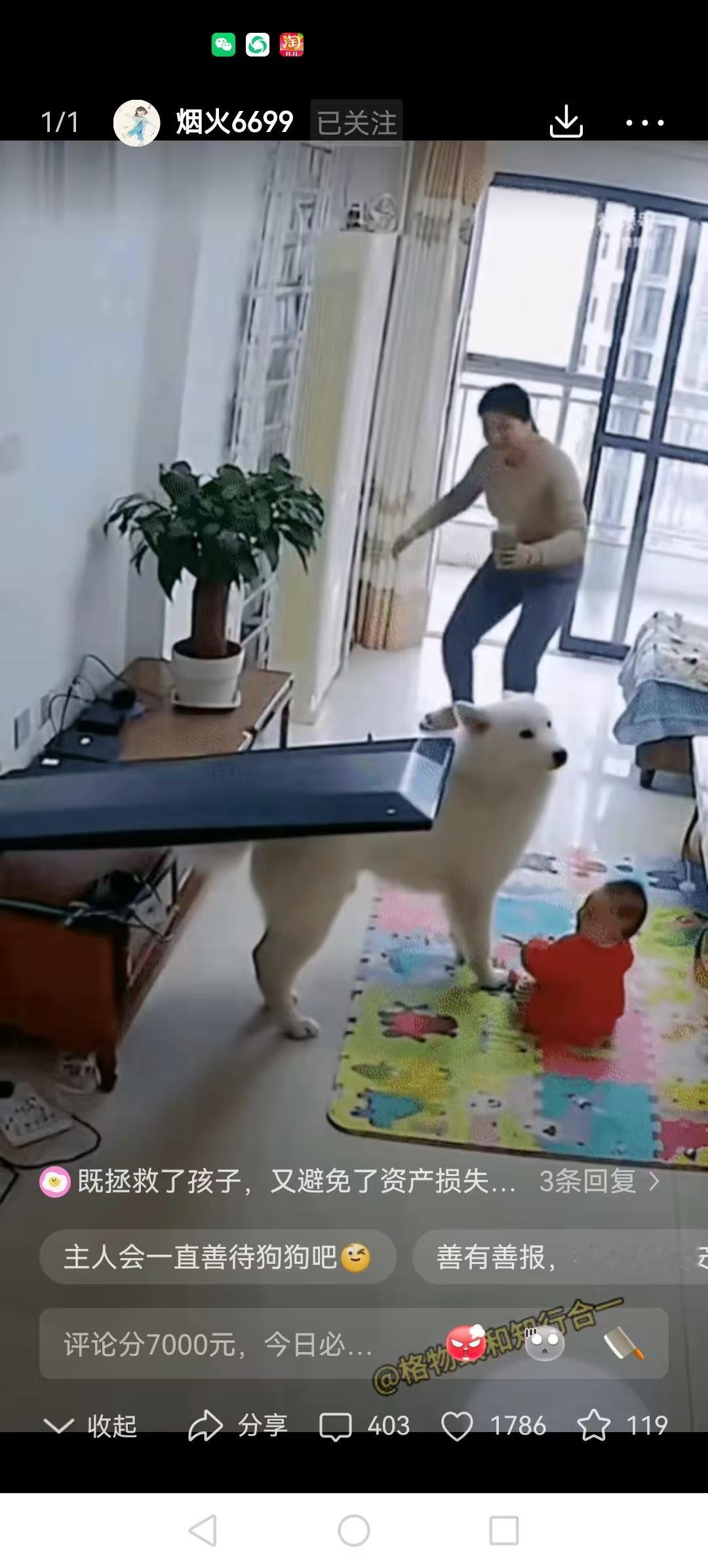 天啦!这个狗狗是来报恩的。不可思议,这哪里是狗,简直是家里的保护神,这是积了多少福报的家庭才修到如此报恩的狗狗。 它灵活矫健地接住电视机,拼尽全力保护婴儿,像在报恩。 狗狗长久陪伴主人家,关键时刻出手,是一种报恩之举,一定要对狗狗好,狗狗还会看门,看小孩玩耍,关健时刻它能出手保护的,这样的狗狗人都喜欢。 狗确实是家中最忠诚一员,永远爱着这个家的每一个人,且永不背判。 忠诚的毛孩子,既救了孩子又保护了家里的财产,好好善待它吧。