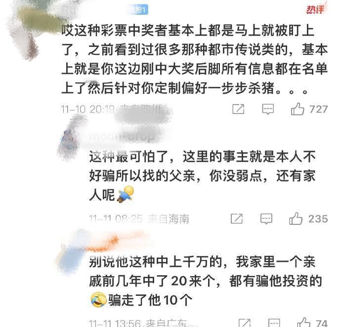 曾经中1200w彩票幸运儿钱被骗光了,税后960万巨款,都是被很低端的骗局 “杀猪盘”+ 亲友借钱霍霍光。果然,当一个人的智商与当前的财富不匹配的时候,财富必然会通过某种形式被重新分配。 这哥们把760万交给父亲打理,结果老人被缅北骗子的“年化30%保本”洗脑,分17次转光所有钱,赃款直接流向境外追不回。自己留的200万也没守住,亲戚朋友扎堆借钱,借出去130多万大多要不回,有人还翻脸说“你那么多钱计较啥”。 其实很多人没中奖时总喊“中了就存银行躺平,谁借都不给”,真中了才懂诱惑有多大,骗子从你露脸领奖、晒凭证时就盯上了,并且会为你量身打造一个骗局。你中千万会怎么守钱?是存银行还是大胆投资?