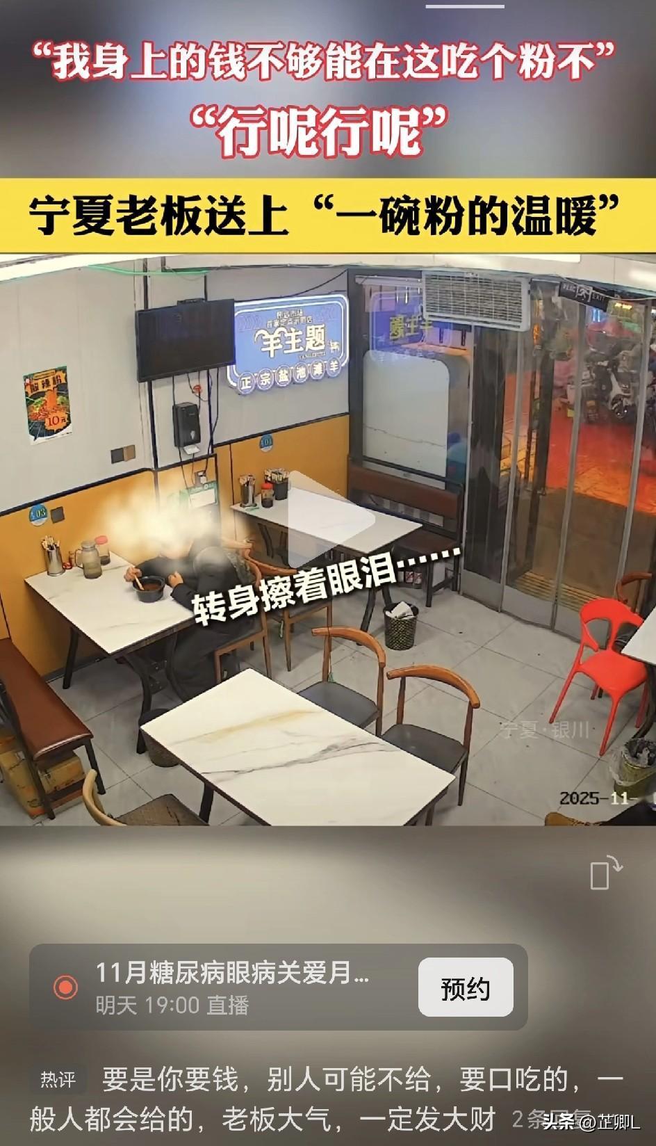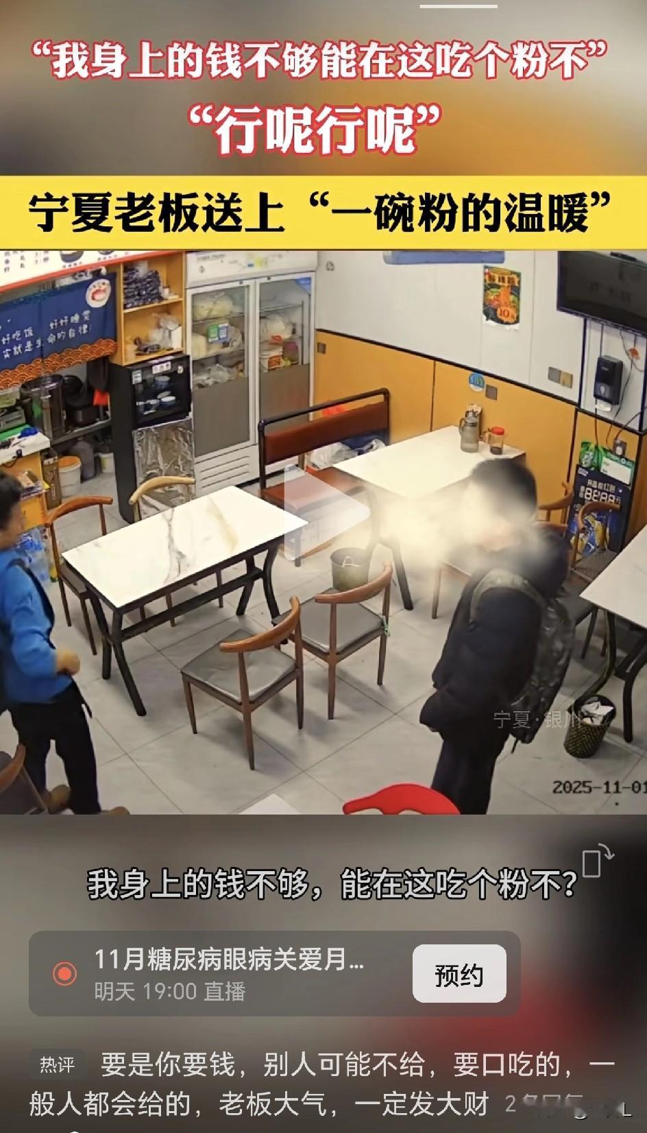 男儿有泪不轻弹,一碗热粉让他破了防!网友:这么有爱心的老板,活该发财! 近日,宁夏银川,怀远市场内,一名男子走进了一家饭馆内,满怀歉意与不安地问老板,“我身上钱不够能在这吃一碗粉不?” 老板没有任何犹豫,直接说,“行呢,行呢!” 接过老板端上来的一碗热气腾腾的粉,男子一面往嘴里扒拉,一面偷偷抹眼泪。 吃完粉,男子一边不停的跟老板说着谢谢,一边倒退着出了店门! 男儿有泪不轻弹,只是未到伤心处!实实在在是一分钱难倒英雄汉。 只是在这个渐凉的秋冬季节,在男子找工作无果又没有钱吃饭的落魄时刻,宁夏老板给的哪里是一碗粉,分明是鼓励他前行的勇气! 网友们纷纷为善良的老板点赞: “为老板点赞👍!” “现在的风气越来越好了,好人也越来越多了,为老板点赞!” “爱出者爱返,福往者福来。” “宁夏正能量!” “为老板的人情味儿点赞!祝你财源滚滚!” “中国人骨子里的善良。如果你要钱,那大家很有可能会忽视你,但如果你要饭,大家会默认你确实遇到困难了,帮不了你太多,但给你管一碗饭也就顺手的事。” “人都有有难的时候,这是到了万不得的时候才开口。有愛心的老板给你点赞👍!” “心里酸酸的,这孩子估计遇到困难了又不和家里人说,说了家人肯定微信会转钱的!” “好人无处不在!” 这大概就是转角遇到爱的善良,相信老板的这碗粉,一定会带给男子继续前行的勇气,会在未来的无数个难捱的日子里,一遍又一遍地温暖着他、鼓舞着他! 终有一天也会让他把这份爱和温暖传递出去! 信息来源于宁夏新闻网,侵联删!