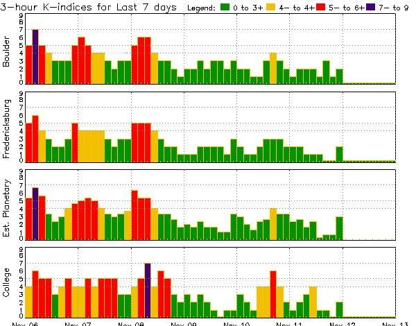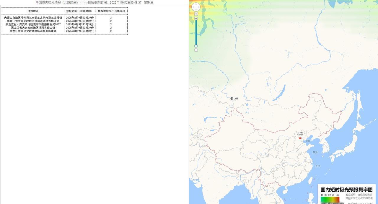 【地磁扰动达到超强地磁暴水平】 【空间天气事件】 ++++++++++ !![红]色警报!! ++++++++++ 北京时间2025年11月12日10时44分,地磁扰动达到超强地磁暴水平,为KP=9 磁纬约40度以北(黑龙江大部、内蒙古东部、北疆)地区需要注意夜空中可能会出现的极光现象,但还需要3小时平均值的监测结果 数据:NOAA-SWPC 发布时间:2025年11月12日10时49分32秒