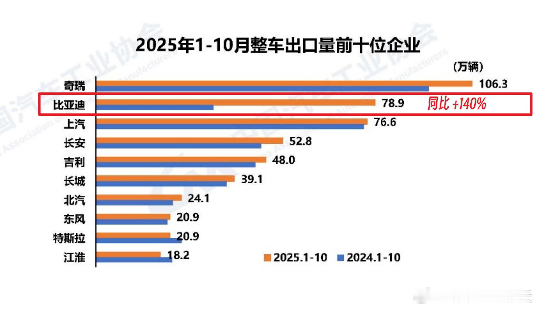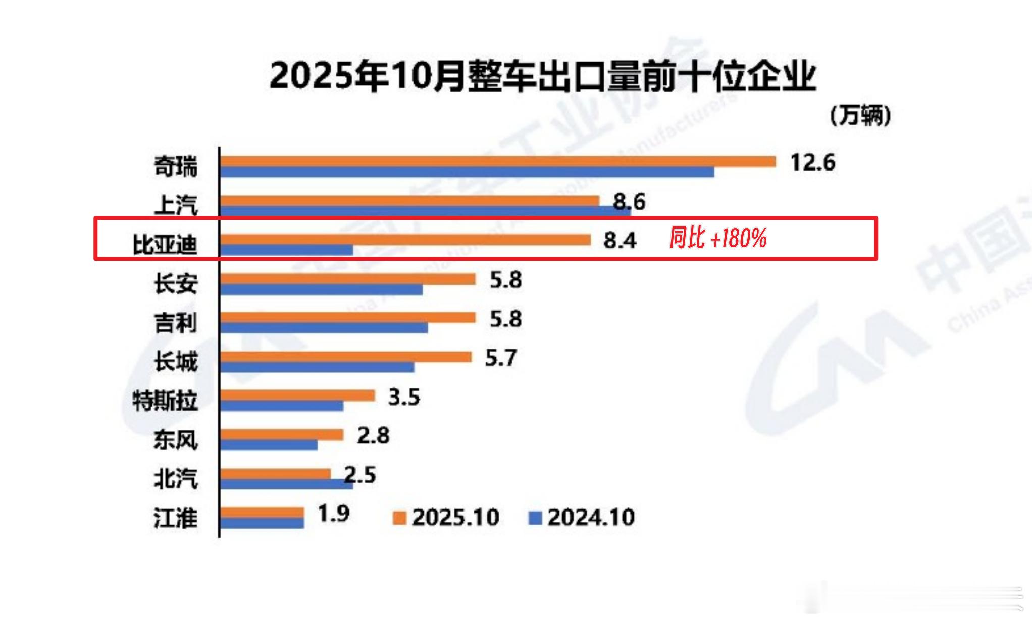 在看10月中汽协的报告,发现「电车出海」业务,格局变化还挺大的~近几年的情况都是奇瑞第一,上汽第二,今年比亚迪的出海业务增长非常迅猛,直接超越上汽,冲到了第二,具体表现:➡️10月份,比亚迪出口8.4万辆,同比增长1.8倍;➡️1-10月累计,比亚迪出口78.9万辆,同比增长1.4倍。比亚迪出海业务真猛,难怪 最近没少聊