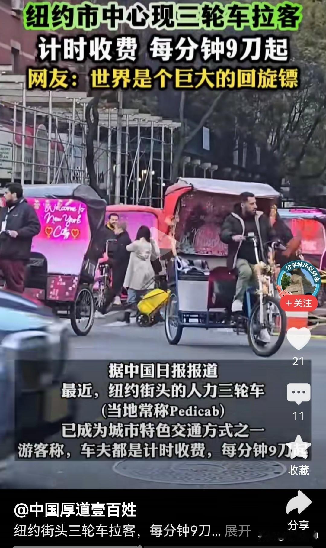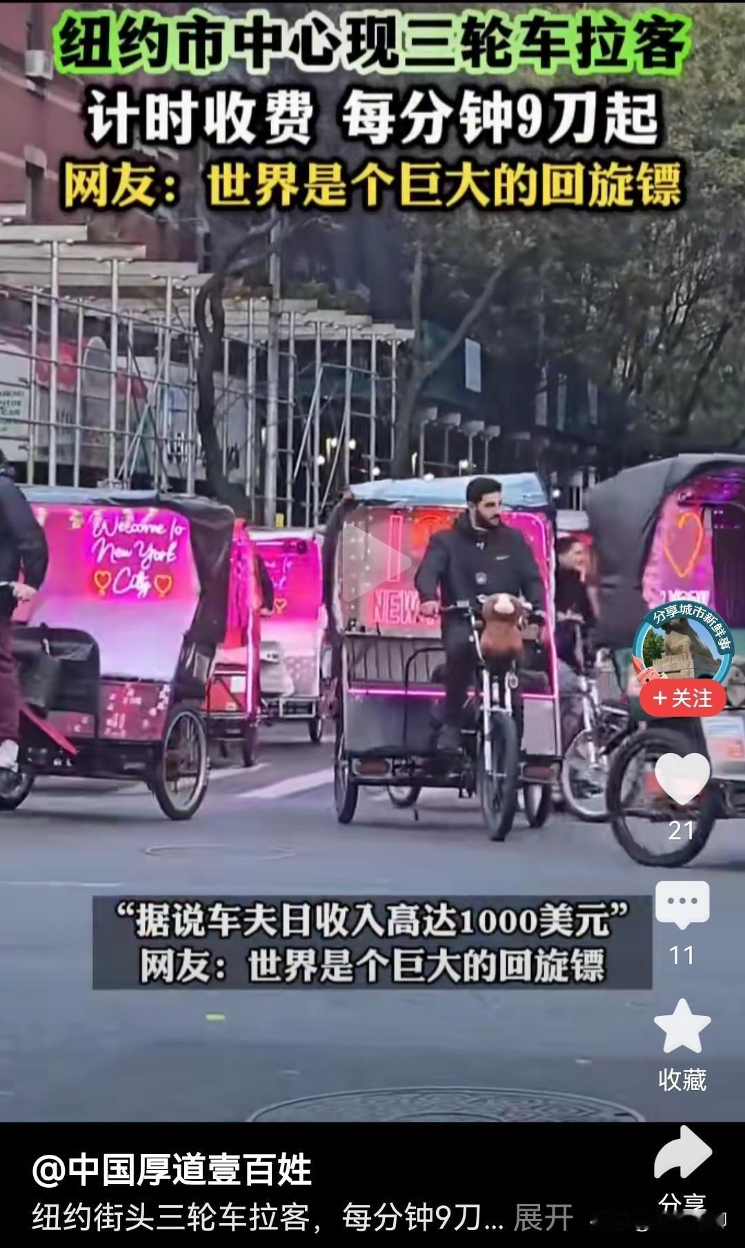 谁能想到,在咱们国家已经被取缔的三轮车拉客现象,居然在纽约出现了,让人不可思议,这和纽约的高大上完全不搭呀! 可你不要小瞧了这些车夫,他们的收入可不低,每分钟9美刀,一天下来大概能赚1000美元,这在美国都是妥妥的高收入人群了,就是不知道还招人不,看得我都想去了[捂脸]!
