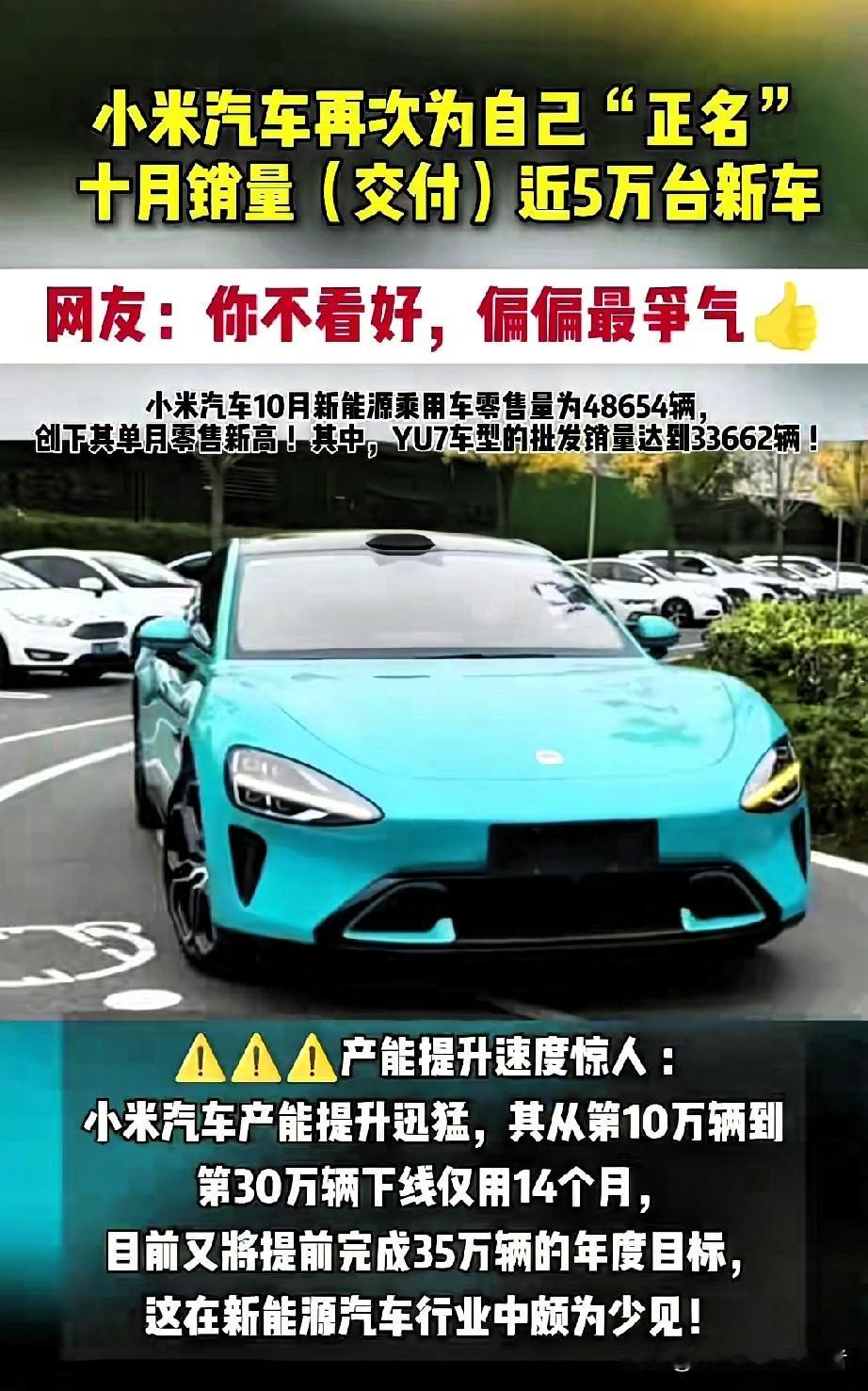 不得不服,雷军又赢了! 小米YU7雷军 但这一次,不只是手机。 谁能想到,这个曾经的“性价比之王”,不仅在手机领域稳扎稳打,更在另一个赛道悄然上演了一场逆袭——小米汽车,10月份竟一举拿下了轿车与SUV双料销冠!据数据显示,小米YU7单月销量突破3.3万辆,SU7也逼近1.5万辆,两者合计超4万辆,甚至超越了行业巨头特斯拉。 手机方面,小米依然强势,双11国产销量冠军的宝座稳如泰山。不少老用户都还记得那款经典的小米6,耐用、流畅、性价比高,陪伴了多少人走过好几个年头。可车呢?毕竟是大宗消费品,很多人还在观望。尤其最近网上对小米汽车的负面评价不少,可偏偏销量不降反升,这背后的原因,确实值得琢磨。 有业内人士分析,小米之所以能在争议中突围,一方面得益于其积累的品牌信任度与用户基础;另一方面,可能也与其精准定位、智能系统与用户运营策略密切相关。不过也有人认为,现在下结论为时过早,汽车不同于手机,长期使用体验与售后服务才是关键。 你怎么看?小米汽车这次是真“站稳了”,还是只是短暂高光?你会考虑入手小米的汽车吗?欢迎在评论区聊聊你的看法!