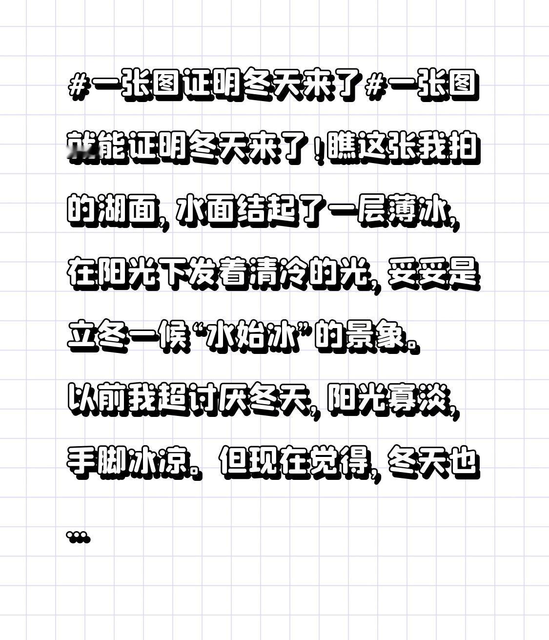 以前我超讨厌冬天,阳光寡淡,手脚冰凉。但现在觉得,冬天也有它的妙处。就像古人说“冬,终也,万物收藏也”,立冬后,人也该放慢脚步。约上好友,一屋两人围炉煮茶,享受这份静谧。冬天虽漫长寒冷,却也给了我们好好歇息的理由。这图,就是冬天到来最有力的证明!