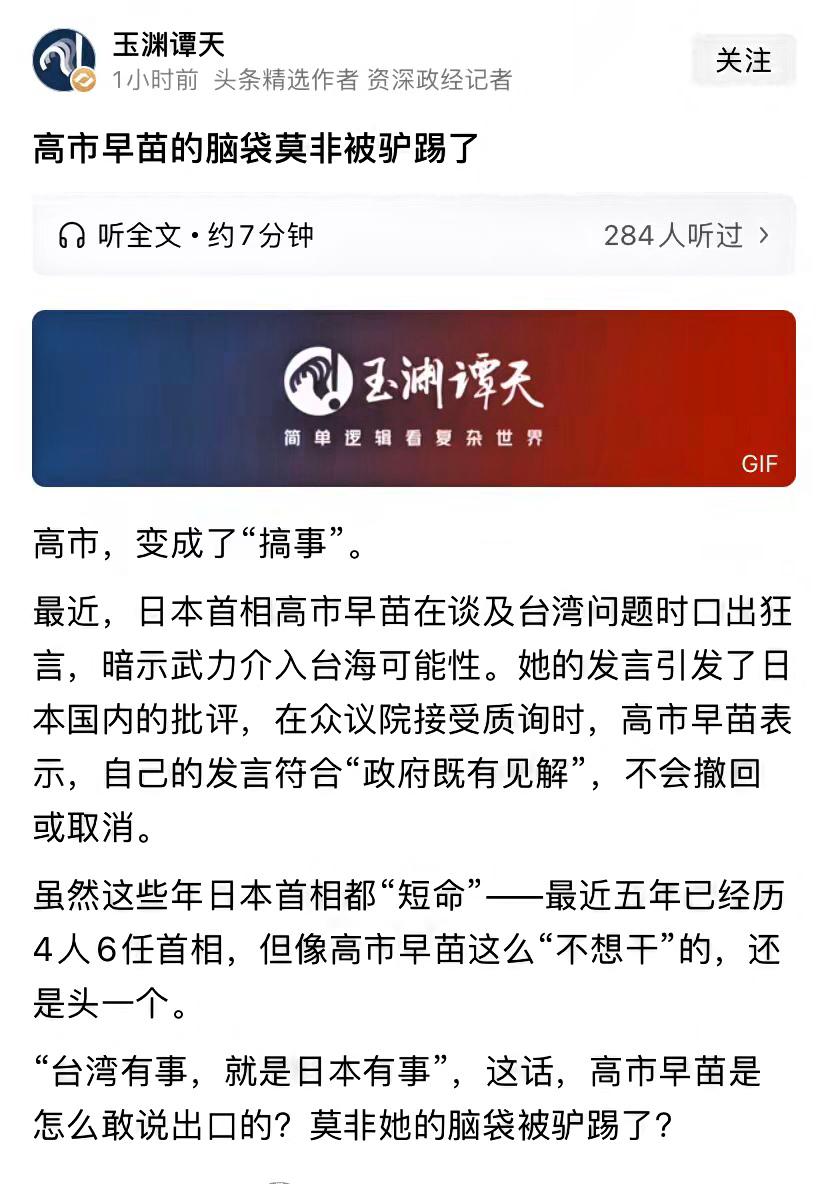 央视竟直接骂日本政要“脑袋被驴踢了”? 这力度,真是开天辟地头一回。 跑国际新闻二十年的老记者都 直呼罕见。 要知道对美日政要,从没这么直白过。 高市早苗的胆子到底有多大? 敢把中国台海问题,和日本“存亡”绑死。 公然扬言台海有事就派自卫队。 这哪里是表态,分明是踩红线找死。 她可不是一时口嗨。 借台海议题给扩军找由头。 趁机撕烂和平宪法的束缚。 背后是日本右翼的危险算计。 美方还在背后纵容撑腰。 日方至今不撤回还嘴硬。 但历史早证明,挑衅中国核心利益。 从来没有好下场。 红线不容触碰,野心必遭反噬,谁想搅乱台海,就先尝尝自食恶果的滋味!