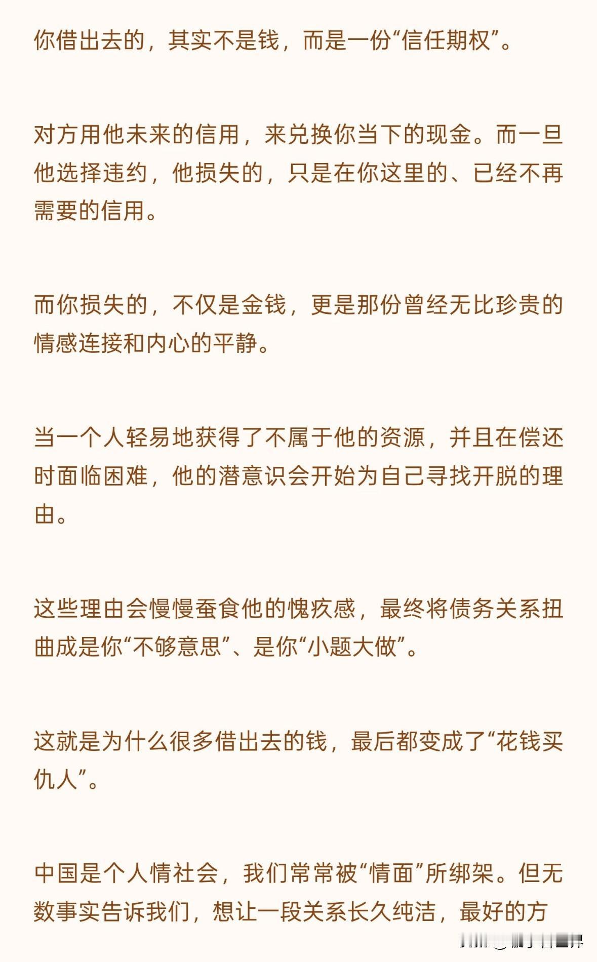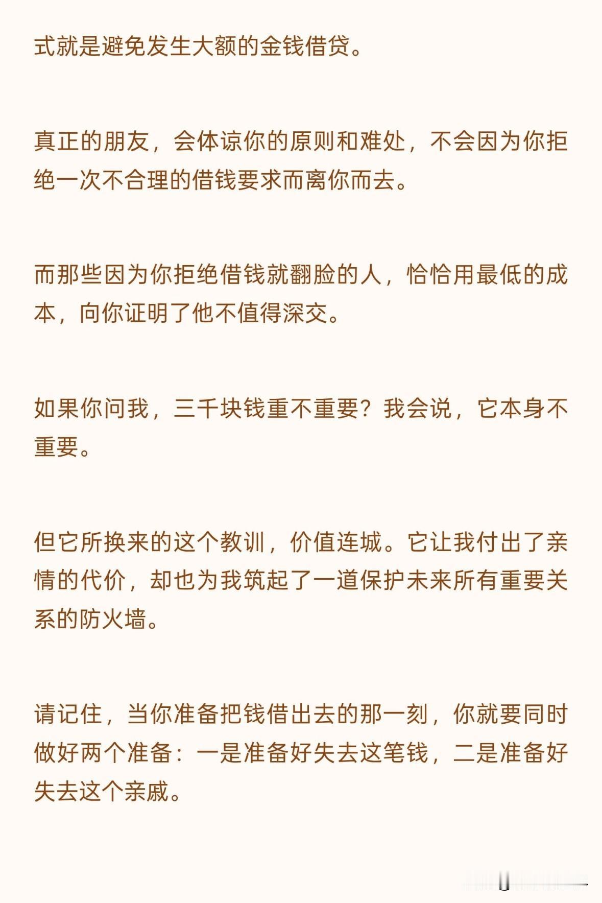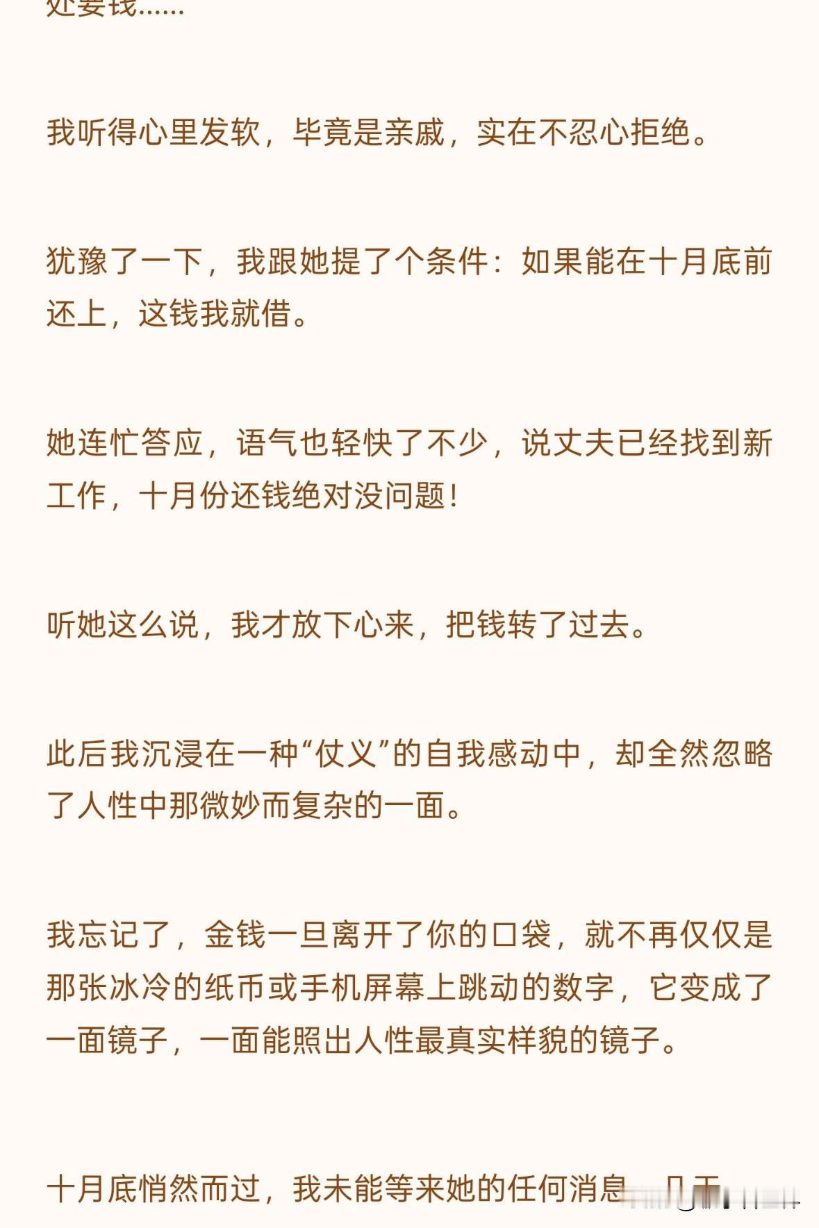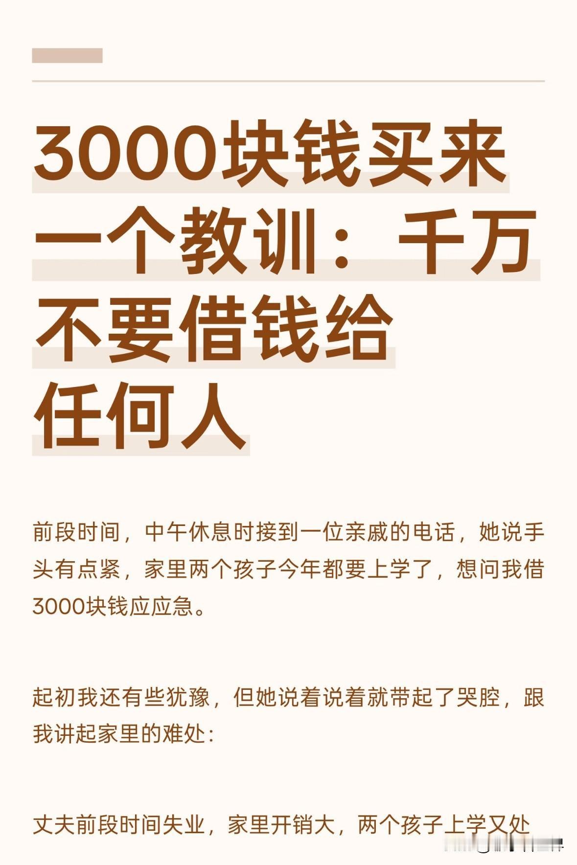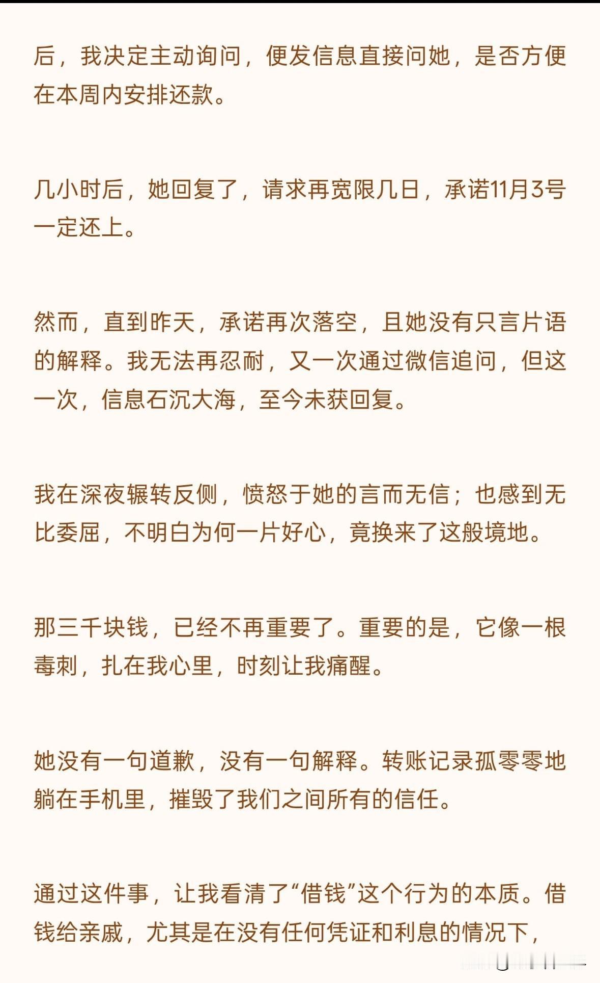 花三千块钱买了个教训:千万别借钱给任何人 我实在搞不懂那些借钱不还的人究竟是什么心态。 要是我找别人借了钱,一有钱就恨不得马上还上,多拖一天我都觉得不自在。 我跟朋友出去玩,她先帮我垫了钱,我都会催着她把账算好,然后把该给的钱给她,不然心里就一直惦记着。 我想不明白,有些人明明没穷到还不起钱,怎么就能心安理得地一直拖着不还呢?难道他们觉得不管用什么办法拿到手的钱,就都成自己的了?
