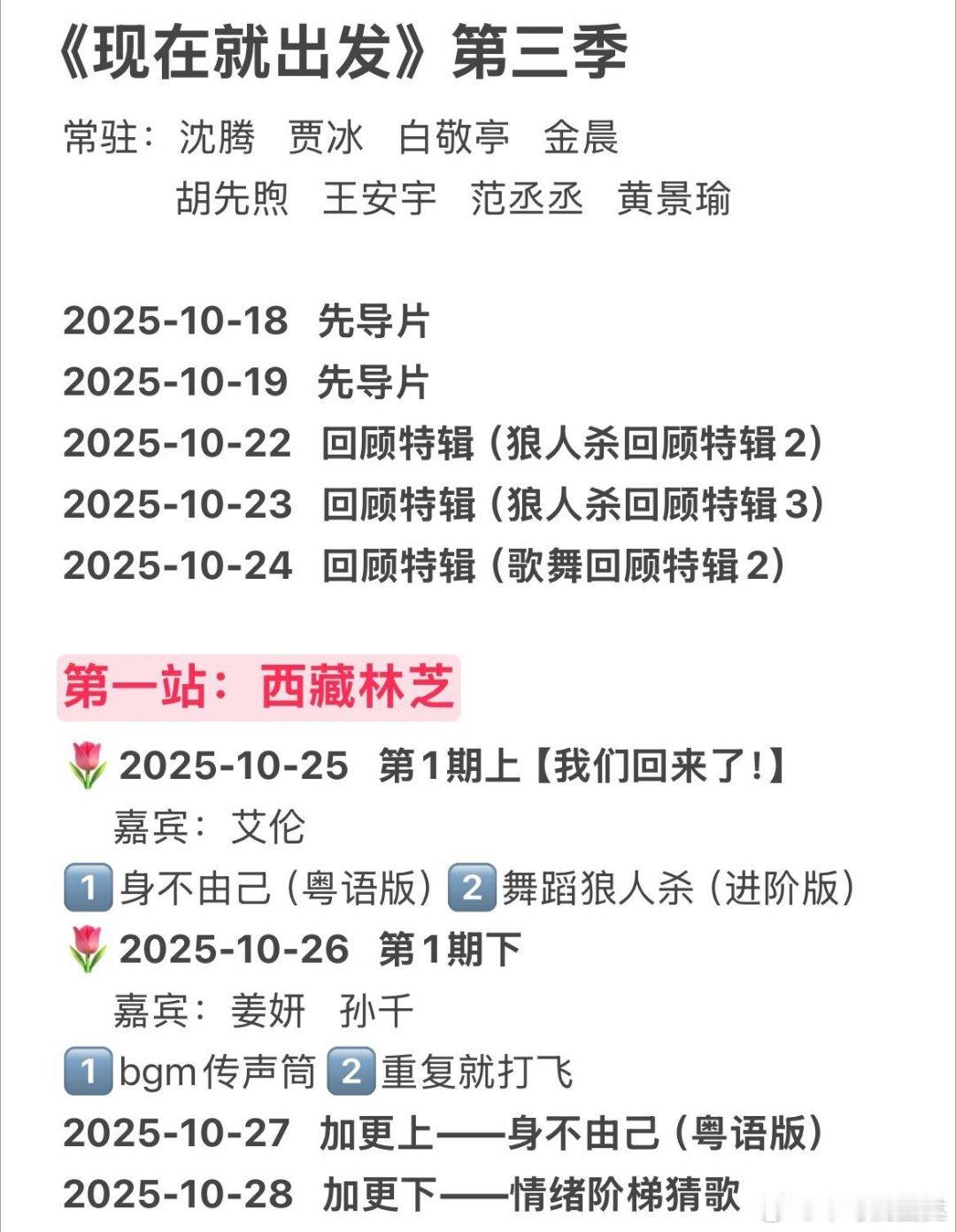《现在就出发》第三季每期内容🌈《现在就出发》第三季既不“尊老”也不“爱幼”的出发团常驻:沈腾、贾冰、金晨、白敬亭、范丞丞、王安宇、胡先煦、黄景瑜⭕️最新的第三季来啦~持续更新中现在就出发3 ‖