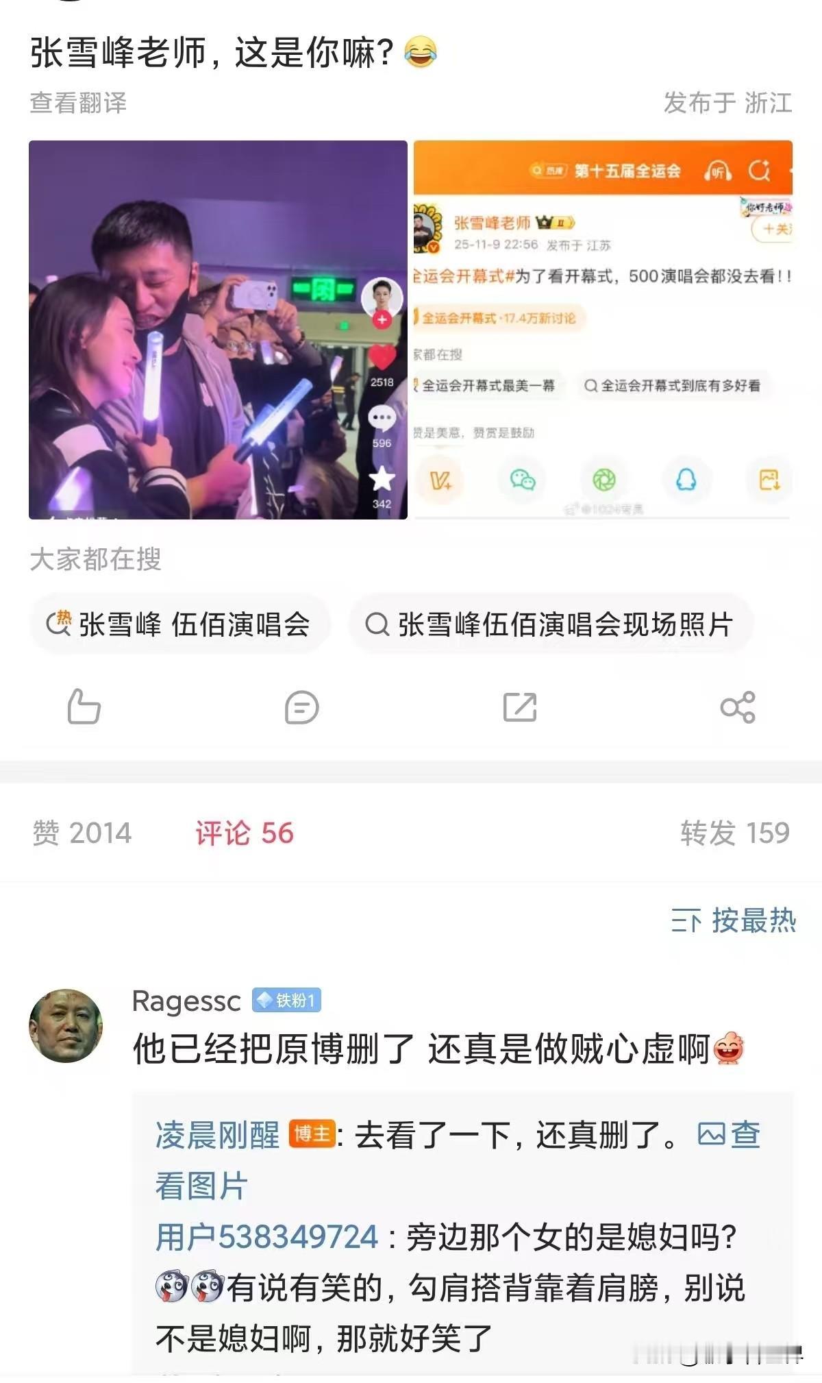 回顾张雪峰事件,有点意思… 11月9日,张雪峰于社交平台发文:“为了看全运会开幕式,500(伍佰)演唱会都没去看!”(彼时伍佰正在苏州奥体中心举办演唱会,张雪峰的公司也位于苏州)。 几乎同一时间,有网友在伍佰演唱会现场拍到张雪峰。画面中,他手持荧光棒,身旁有位女子亲密地依偎在他肩头,二人互动甜蜜。 随后,张雪峰删除了“没去演唱会”的微博。11月11日直播时,他展示婚戒回应“出轨猜测”:“真有事我早在家被胖揍了,还能戴着戒指直播?” 我只想说,不像是原配夫妻,哪有这个腻歪劲啊哈