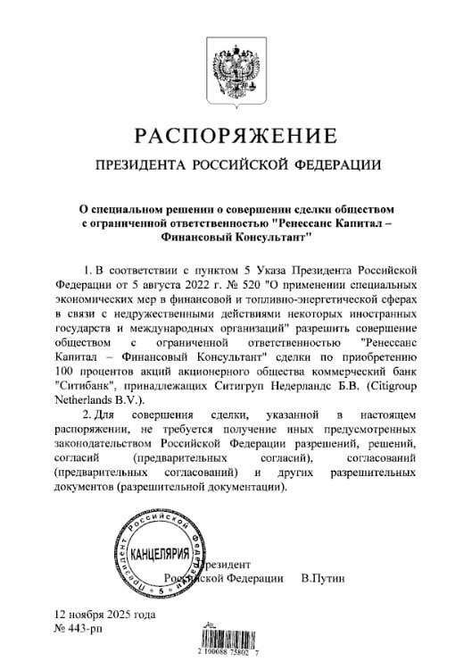 弗拉基米尔·普京批准"复兴资本"收购俄罗斯花旗银行100%股权。