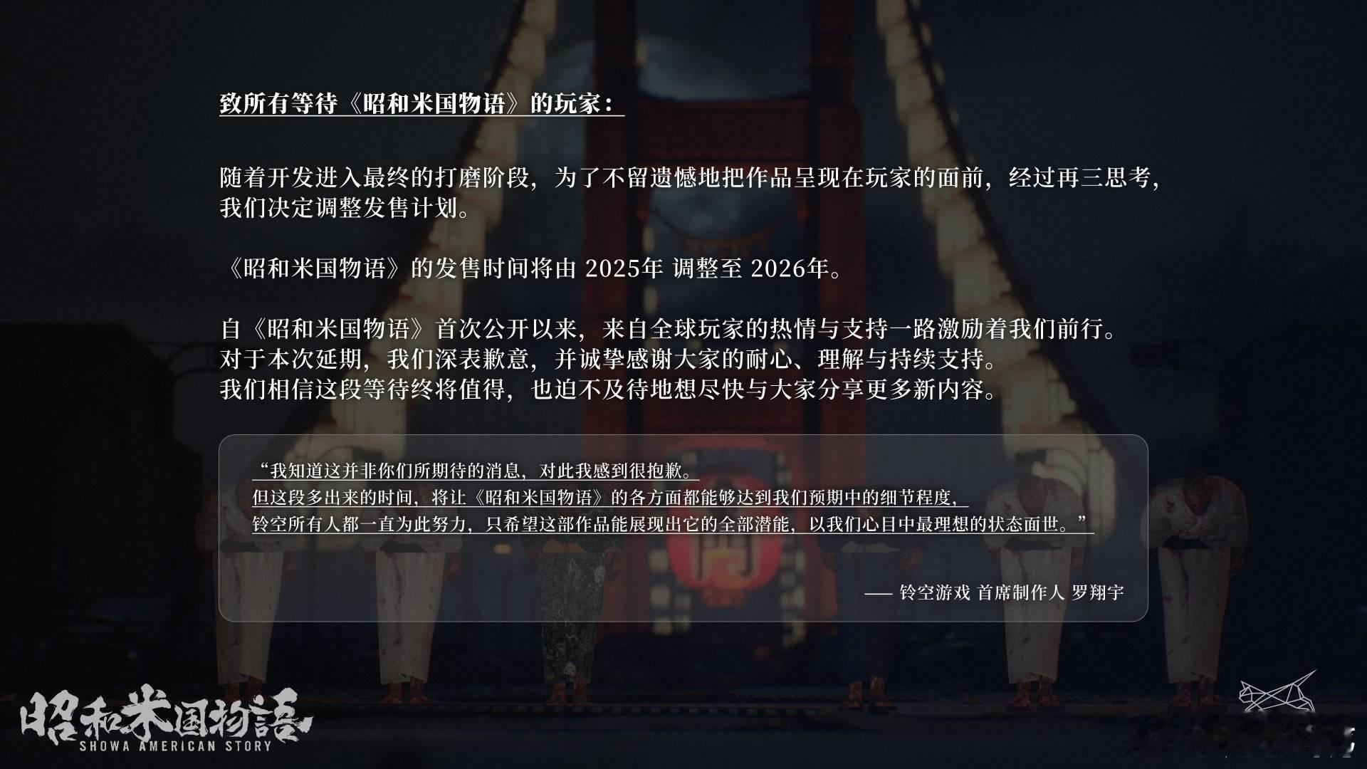 【国产RPG新作《昭和米国物语》宣布延期】国产RPG游戏《昭和米国物语》宣布延期,由原定的2025年调整至2026年推出。制作人发文表示:“做出延期这个决定让我很难过,但即使如此,我依然不想留下任何遗憾。”《昭和米国物语》由铃空游戏开发,背景设定在昭和66年(1991年),日本殖民美国后的一场"灾变"导致丧尸病毒爆发。 玩家将在游戏中扮演死而复生的少女“蝶子”,在末世中寻找妹妹并一路揭开更多真相。