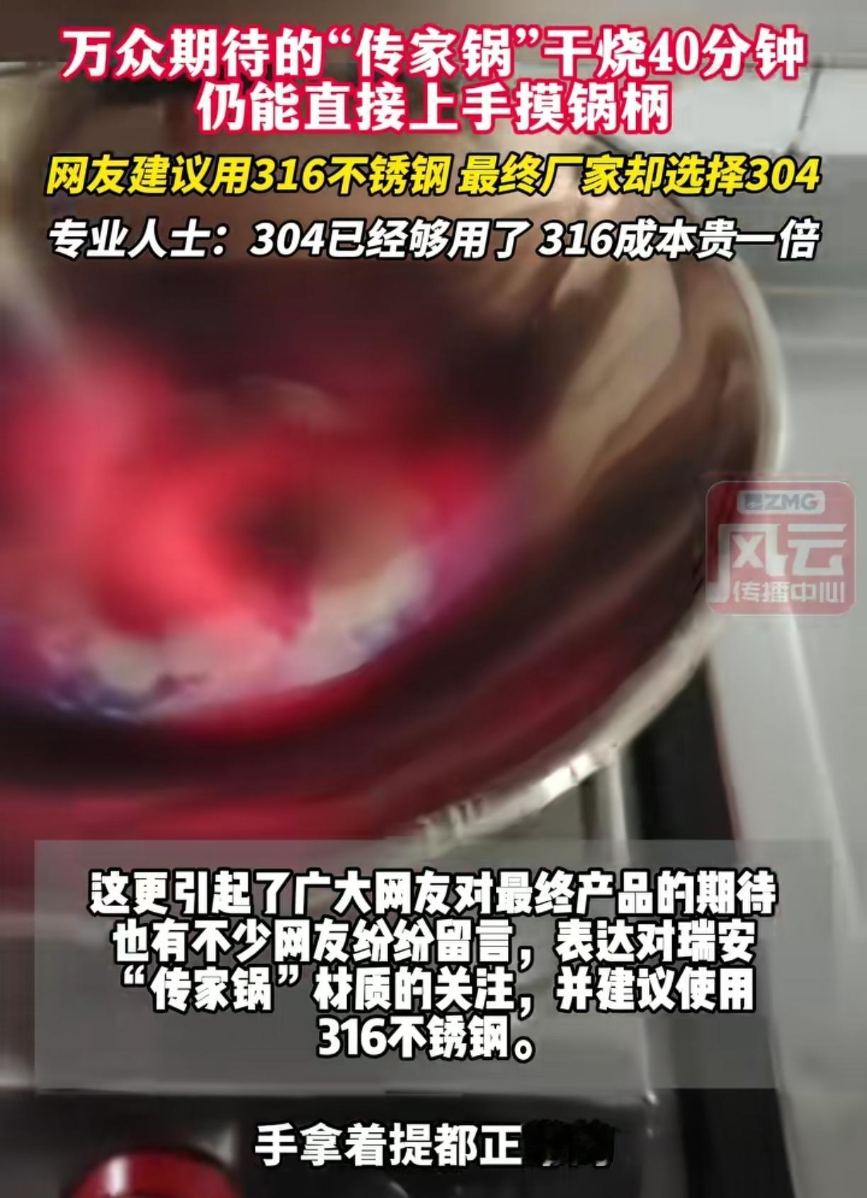 瑞安传家锅干烧测试结果令人震惊 整整在火上烧了40分钟,锅体通红,锅没变形,而且锅柄没事,仍然可以上手摸,不会出现烫手的情况,锅底不会变黑,几十年前的老手艺真的是牛啊! 值得等待! 网友留言“可不可以做316材质”? 老板考量了很久,还是坚持使用的304不锈钢材,他觉得以前的锅用的也是304,可以做到一锅传三代,现在的材质和技术更好,304已经可以满足大伙的需求。说实话,价格摆在这里,304的锅卖几十块钱,已经没啥利润了,如果用316或者316L,这个成本就不知道上去多少倍了,到时候锅肯定不止卖几十块这么便宜了! 但架不住有的网友想要啊,纷纷留言要316材质,老板还未回应,如果真的不差钱也不是不能做,可以做成两个型号供大家选择也挺不错的。 昨天轰动挺大的还有宝宝留言 “可不可以加双耳”? 网友们议论纷纷“加双耳就不好颠锅了” 也有人说“我不会颠锅,我需要加” 其实现在很多品牌锅都是多款式的,无耳,单耳,双耳都有,多样式,咱希望传家锅也能整出更多款式和花样满足大家伙的不同需求,希望老板能听见看见大家的声音! 瑞安不锈钢锅 瑞安锅 瑞安传家锅 瑞安不绣钢锅 瑞安五星锅 瑞安传奇锅
