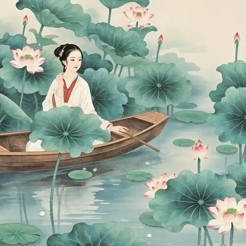 上联:群鸭入水荷漫舞 下联:孤舟泊岸柳轻摇