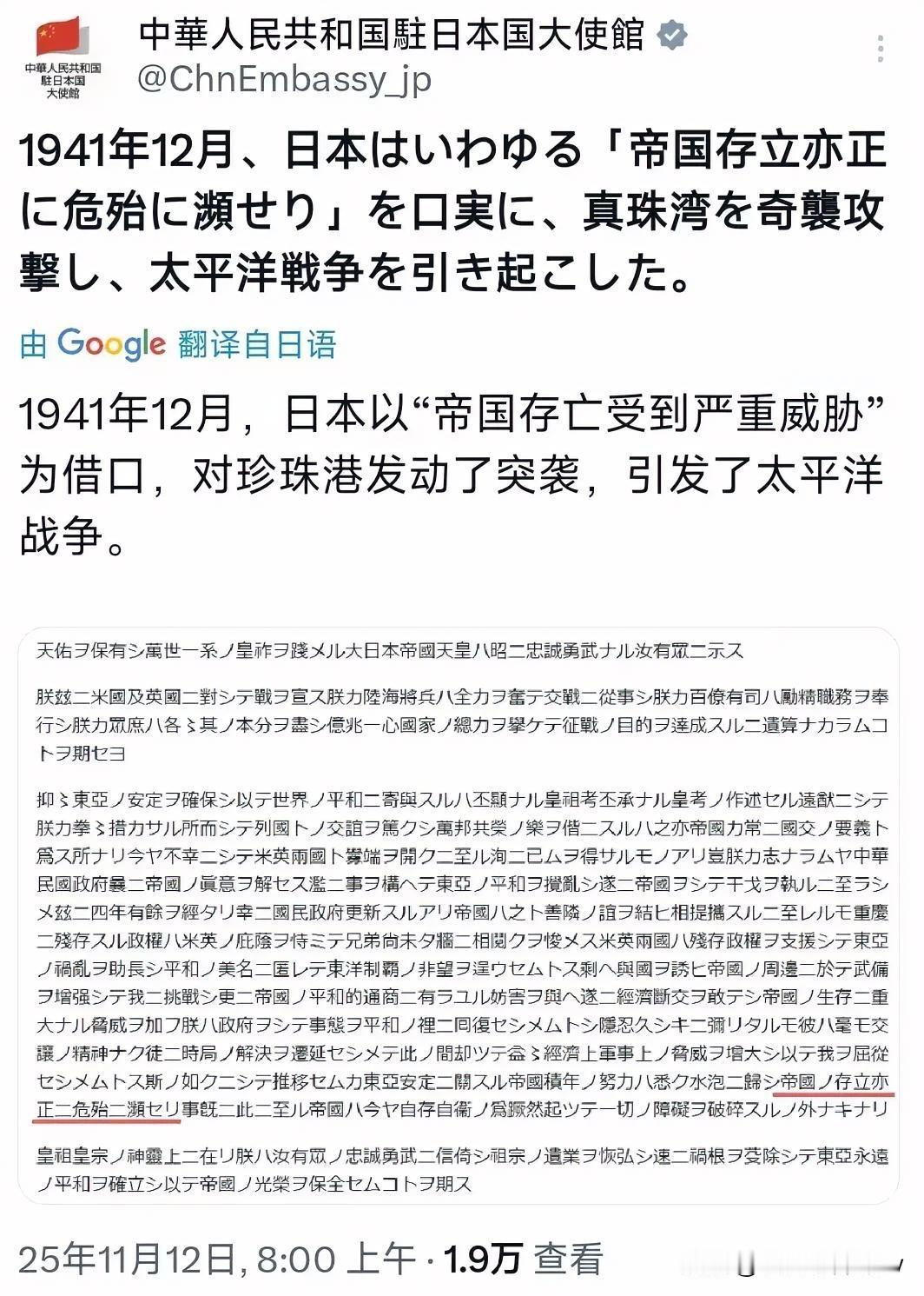 历史惊人相似!驻日使馆戳穿日本80年旧把戏,高市早苗言论引众怒 2025年11月12日,中国驻日大使馆发文揭批:1941年12月日本以“帝国存续濒临危殆”为借口,偷袭珍珠港引爆太平洋战争,这一侵略话术如今再度现身。 11月7日,日本首相高市早苗在国会宣称,若台海出现海上封锁等武力场景,将构成日本“存亡危机事态”,自卫队可行使集体自卫权,后续更坚称不会撤回该表态。 这番言论遭日本在野党齐声反对,立宪民主党党首直呼“危险”,《朝日新闻》社论批评其轻率扩大法律解释,为军事介入他国事务打开方便之门。 11月10日外交部严正交涉,12日国台办痛斥:日本殖民台湾50年罪行罄竹难书,80年后妄图阻挠中国统一,中国政府和人民决不容忍。 美国总统特朗普受访时直言“很多盟友不是朋友”,未对日本表态撑腰。历史早已证明侵略必遭反噬,日本执意绑定台海议题,终将引火烧身!