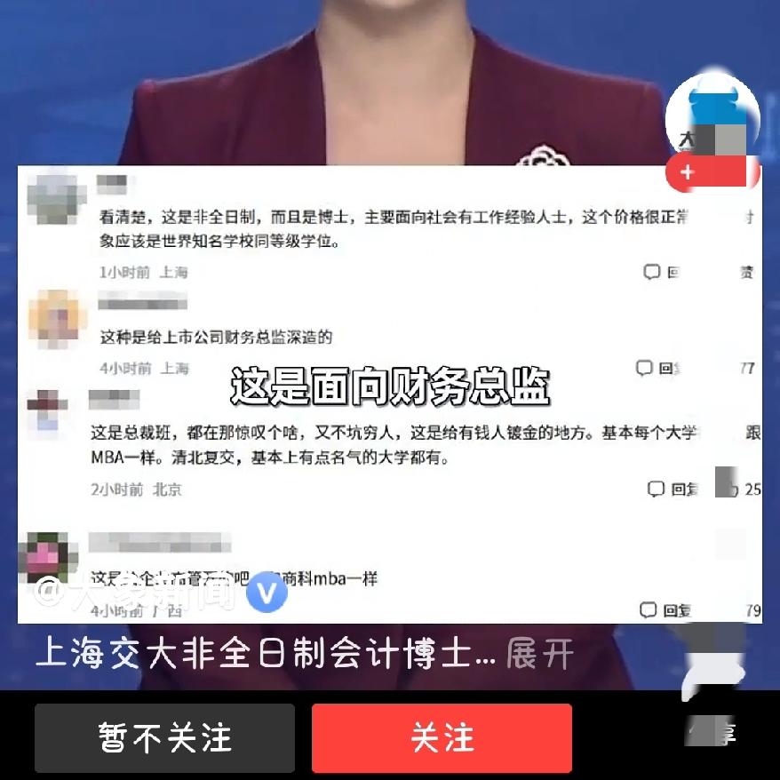 上海惊现天价学费? 谁看了不懵? 上海交大这波操作直接上了热搜,78万4-6年非全会计博?但也不存在贵,这压根不是给普通学生准备的啊! 你想,非全+博士+会计,明摆着是给有工作经验的职场大佬深造用的。就像评论说的,这是上市公司财务总监的“镀金场”,人家花78万买的不是学历,是顶尖资源和圈层入场券。 现在博士扩招,但这种高成本项目,早把“受众”筛得明明白白,他并不是坑穷人,而是跟普通人赛道不同,就像。有些大学里的mba一样。 咱就是说,与其吐槽价格,不如认清:学历早不是单一的“学习渠道”,而是不同圈层的“专属工具”了。 你们觉得这种高成本学历项目,值不值?上海交大硕士 上海大学 深造