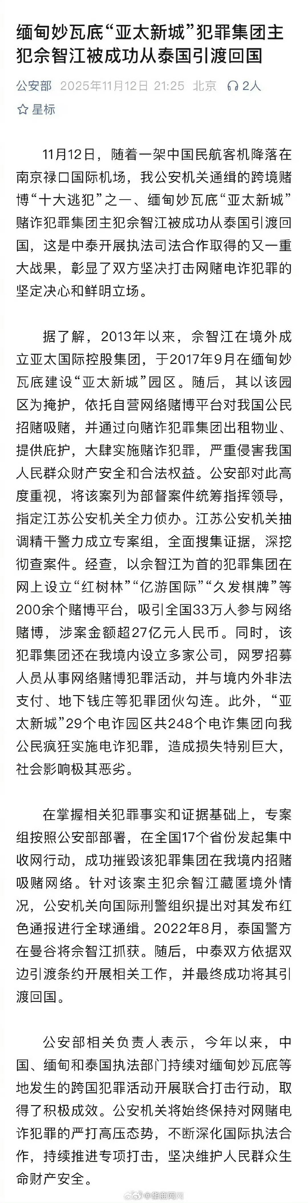 【】 11月12日,随着一架中国民航客机降落在南京禄口国际机场,我公安机关通缉的跨境赌博“十大逃犯”之一、缅甸妙瓦底“亚太新城”赌诈犯罪集团主犯佘智江被成功从泰国引渡回国。案件详情公布↓(公安部)
