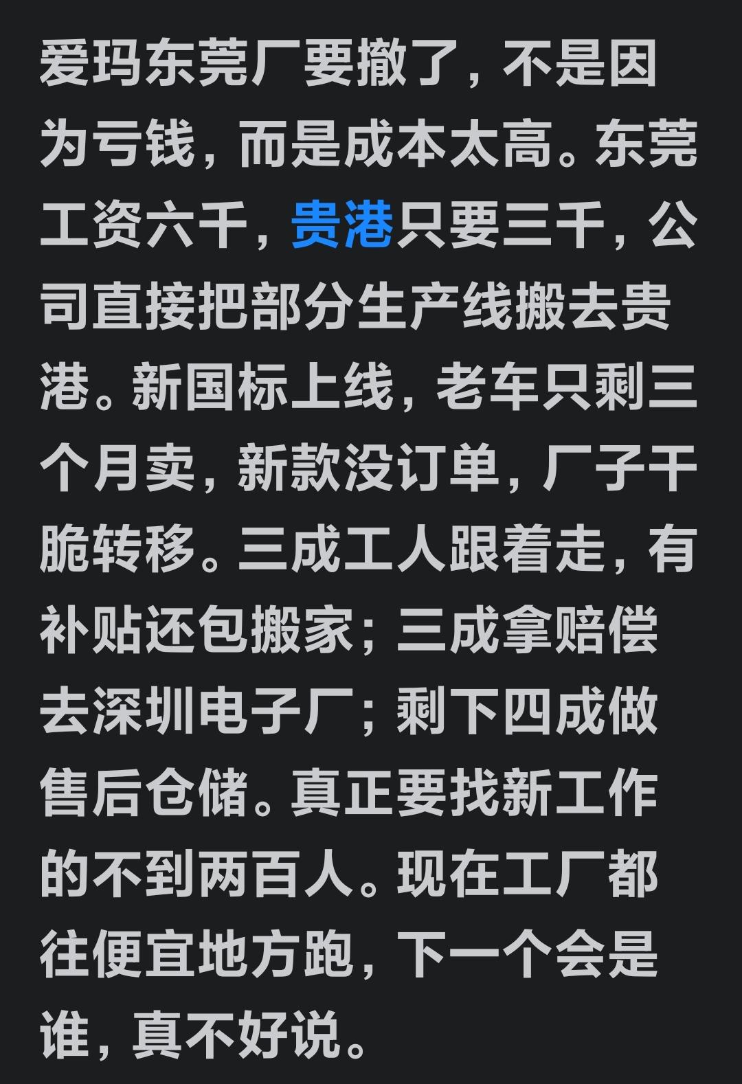 省了相差一半工资,你是老板心里想的都是美达达。 前段时间就看到新闻说,东莞长安的大型工厂爱玛电动自行车厂,由于长安场地费用高、人工成本贵,老板实在头疼,无计可施,打算搬到广西去。 贵港的场地费和人工成本比东莞省一半,广西贵港还给出了极大的优惠,老板不搬才怪! 实在想不明白,广东也有个偌大的非珠地区,地方优惠政策难道真比不上广西贵港吗,竟让老板们不辞千里去广西贵港投资设厂!