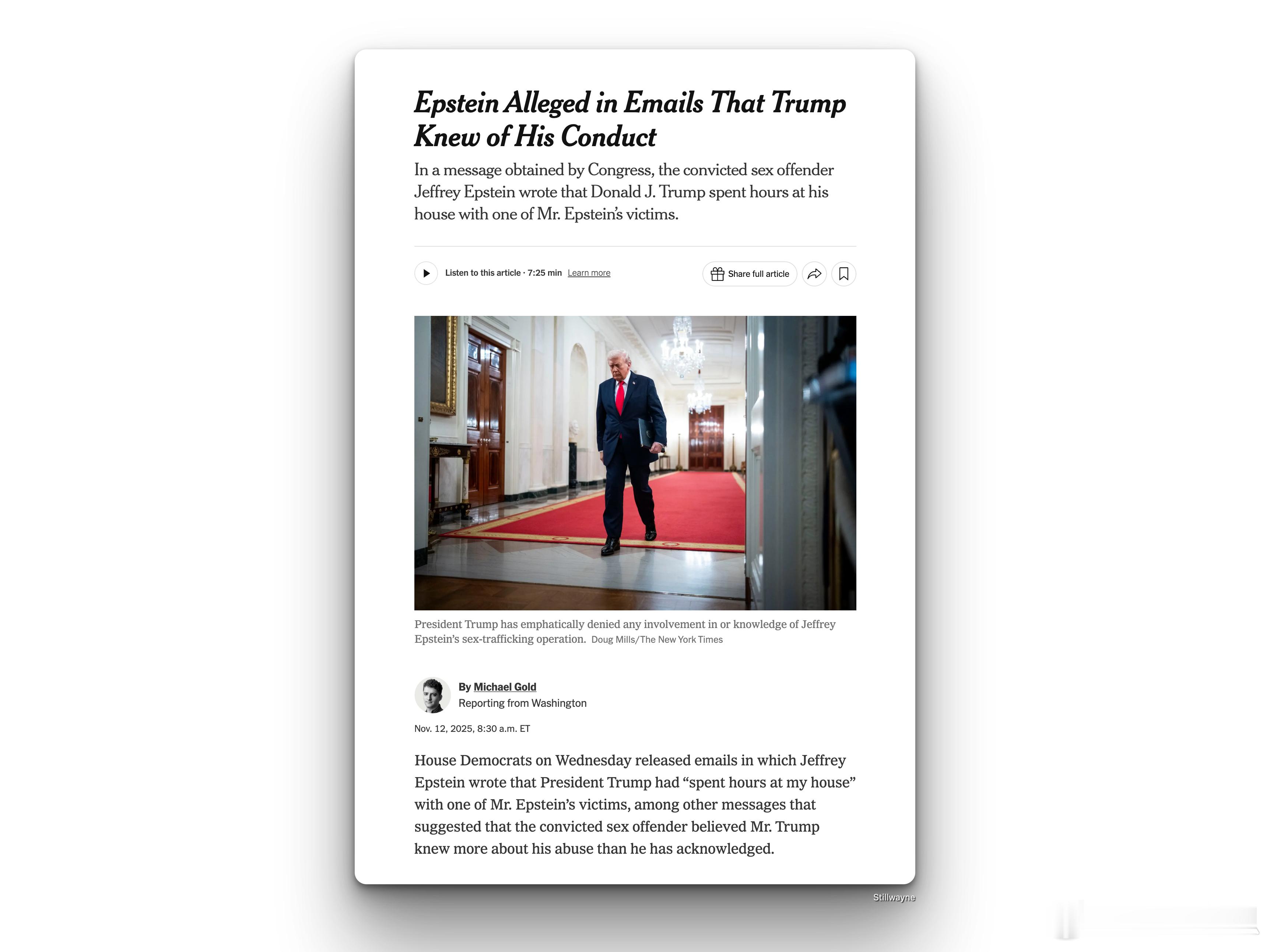 最新爱泼斯坦邮件显示,特朗普曾与一名受害者在爱泼斯坦家中“共处几个小时”。在国会获得的一封信中,被性犯罪者爱泼斯坦在邮件里写到,特朗普曾在他家中与一名性犯罪受害者待了几个小时。邮件中还包含其他内容,暗示爱泼斯坦认为特朗普对他的性侵行为了解得比他公开承认的更多。这些邮件的发送时间距离特朗普和爱泼斯坦发生冲突已过去数年。其中一封邮件发给了爱泼斯坦前女友麦克斯韦,另外两封则发给了作家迈克尔·沃尔夫。在一封 2011 年 4 月的电子邮件中,爱泼斯坦写信给麦克斯韦说道:“我想让你意识到,那只一直没叫的狗是特朗普。”他还补充说,“(一名受害者)曾在我家里和他一起待了好几个小时……但他一次都没提过。”麦克斯韦回复说:“我一直在想这件事。”最后一封电子邮件的时间是 2015 年 12 月 15 日,那天晚上正值共和党总统初选辩论。沃尔夫给爱泼斯坦发邮件提醒说:“CNN 计划今晚在辩论现场或之后的采访中,询问特朗普有关你们关系的问题。”爱泼斯坦回复道:“如果我们能帮他想个回答,你觉得该怎么说?” 沃尔夫建议不要采取行动,并推测特朗普可能会试图淡化或否认两人的关系:“我认为你应该让他自己作死,”他写道,“如果他说他没坐过飞机、没去过你家,那这会给你带来宝贵的公关与政治筹码,可以日后用来‘吊打他’,或者‘拯救’他,让他欠你人情。”