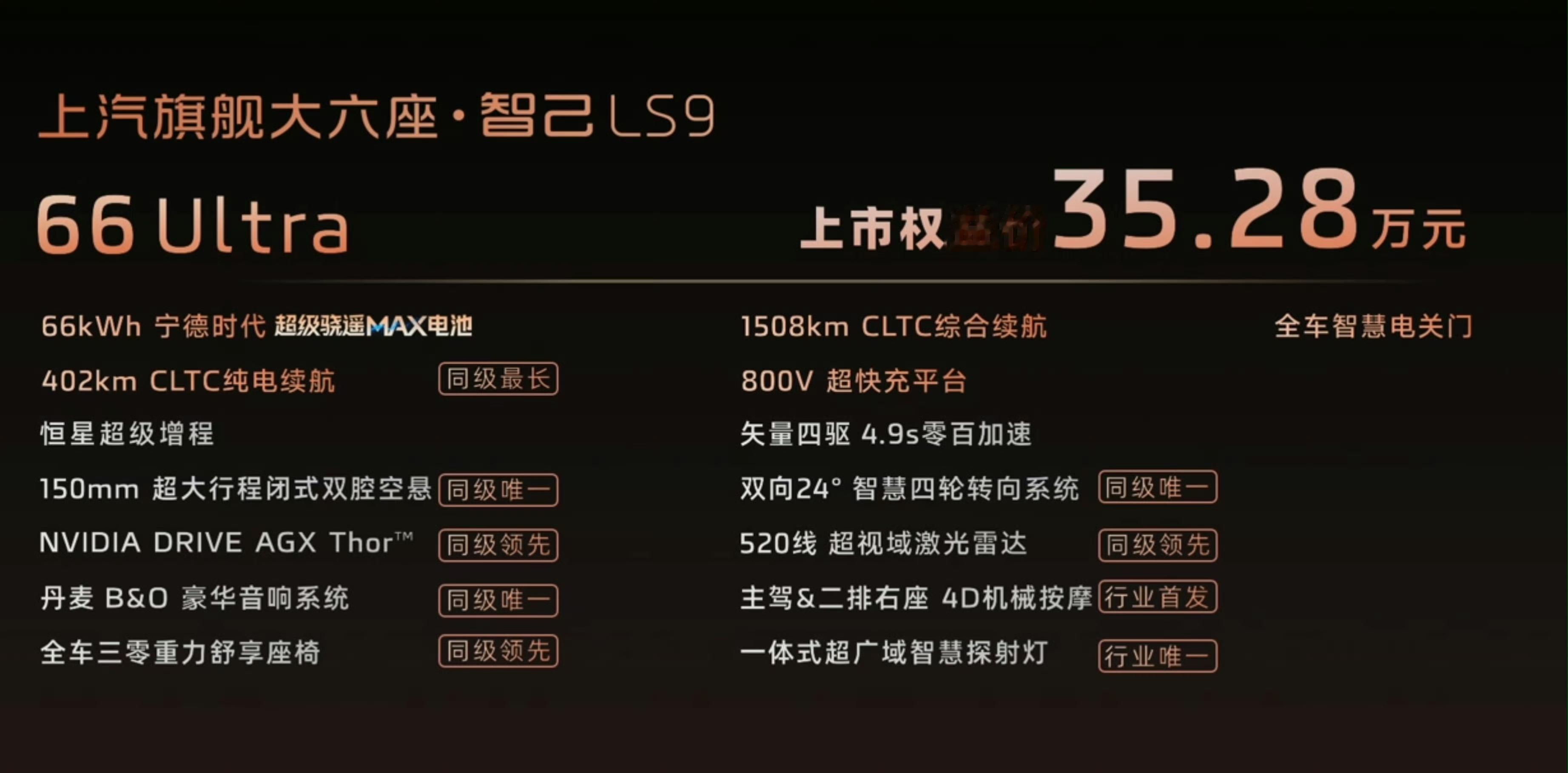 上汽旗舰大六座智己LS9上市,售价32.28-35.28万。配置老全面了,52度和66度的大电池增程车+4C超充;前后双电机四驱,综合功率分别为380千瓦和390千瓦;全系配备520线的激光雷达+英伟达Drive AGX Thor芯片;车里还有三把零重力座椅+机械座椅按摩;甚至后备厢还能应急洗浴。大哥级SUV今年卷疯了!