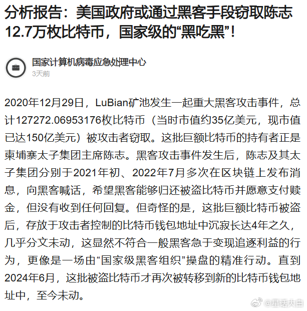 有人问,就随手辟个谣。这两天,西方媒体和港媒又开始标题党造谣说《太子集团否认涉诈骗 中国当局指控美国“窃取”陈志比特币》,这样的标题容易让人误以为,我方站台太子集团。但真相是,“国家计算机病毒应急处理中心”在11月9日发了篇分析报告,标题是《美国政府或通过黑客手段窃取陈志12.7万枚比特币,国家级的“黑吃黑”!》。其实这篇报告只是从技术层面揭露美国如何“黑吃黑”,而且重点是“黑吃黑”,显然不存在给诈骗集团背书,更谈不上“指控美国”,顶多就是以分析报告的形式,批判一下美国黑吃黑。