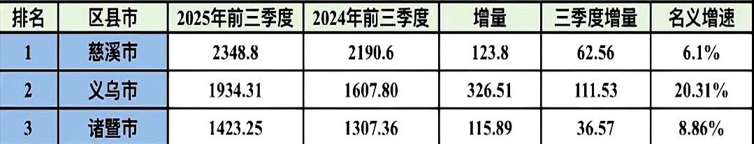 就差2个亿。 真的,就差2个亿。 去年年底,诸暨就比乐清多了这么点儿GDP。一口气的距离。 一个温州大佬带出来的狠角色,一个绍兴师爷堆出来的富家子。浙江老三的位置,谁不眼馋? 所有人都以为,今年乐清反超是板上钉钉的事儿。温州人嘛,你懂的,搞经济从来不跟你客气。 结果呢? 前三季度数据一出来,傻眼了。 差距不但没缩小,还被人家甩开了60多个亿。 你说这叫什么事儿? 是诸暨突然吃了什么灵丹妙药,还是我们乐清憋着什么核武器级别的大招,非要等到最后一个季度才放? 这哪是比GDP啊。 这比的是一口气,是两个地方老百姓心里那点儿不服输的劲儿。 年底的报表,估计会比贺岁档电影还精彩。 我就搬个小板凳,坐着看。