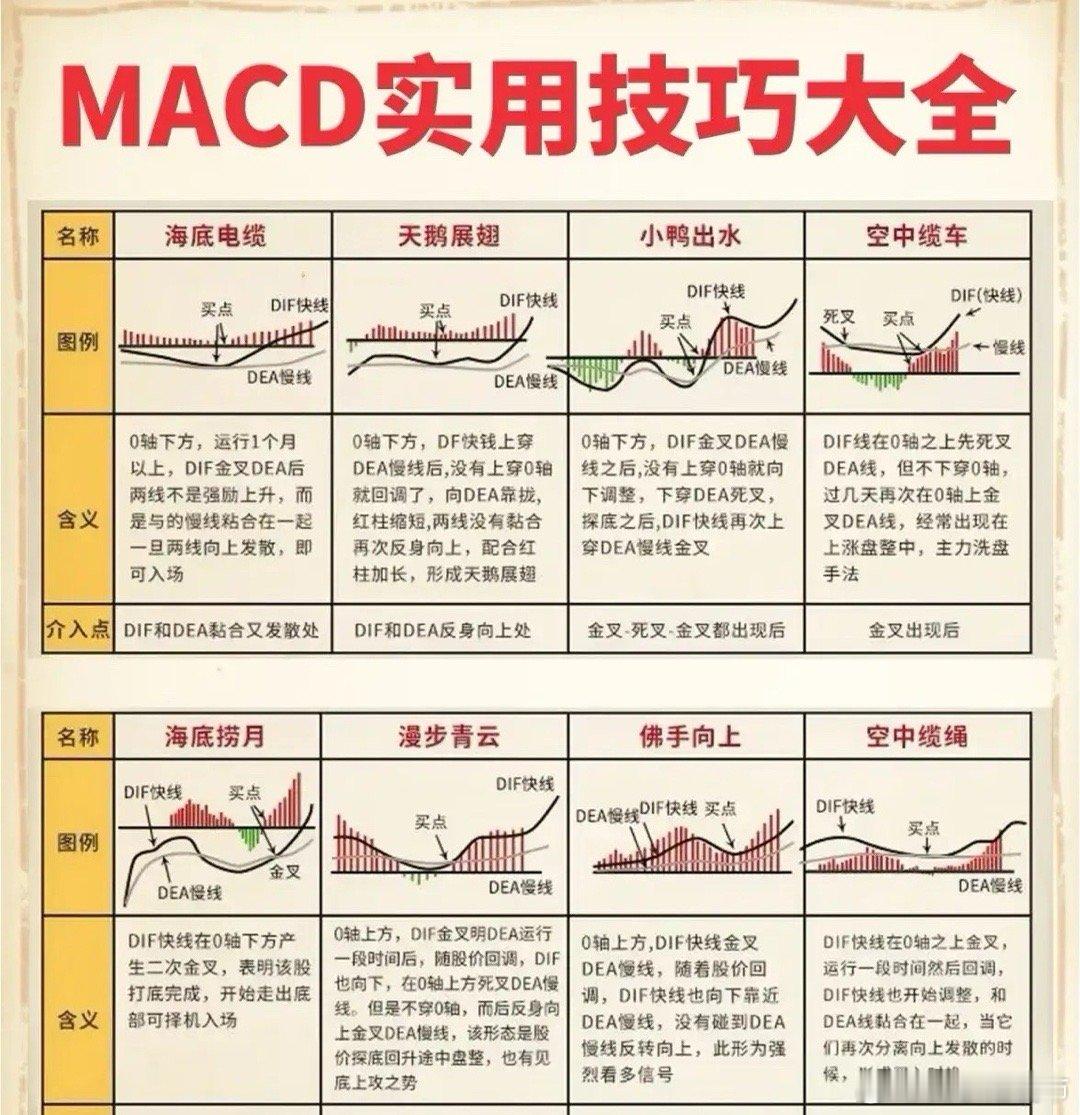 MACD形态实战精要:捕捉趋势转折的八大经典信号MACD是技术分析中极为重要的趋势判断工具,其金叉、死叉与0轴的交互关系,常衍生出多种典型形态,揭示不同阶段的买卖机会。图中系统归纳了八类常见MACD形态,每一类都具备明确的图形特征与介入逻辑。在底部区域常见“海底电缆”,指DIF与DEA长期在0轴下粘合后首次向上发散,是底部启动信号;“天鹅展翅”则是在0轴下金叉后未破0轴便回踩DEA,随后再次上行,显示底部韧性;“小鸭出水”经历金叉—死叉—再金叉的过程,反映反复筑底后的真正突破。“空中缆车”出现在0轴上方,DIF死叉DEA但未破0轴,数日后再度金叉,属于强势洗盘后的再攻信号;“海底捞月”为0轴下二次金叉,意味着底部夯实,反弹更为可靠;“漫步青云”则是在0轴上死叉不破0轴再金叉,属于中继整理结束信号。“佛手向上”为DIF在0轴上回靠DEA但未接触即拐头向上,属强势延续形态;“空中缆绳”则是DIF与DEA在0轴上粘合后再次发散,代表新一轮上攻开启。掌握这八大形态,有助于投资者在股价不同阶段识别主力意图,精准捕捉起涨点,实现高效择时。