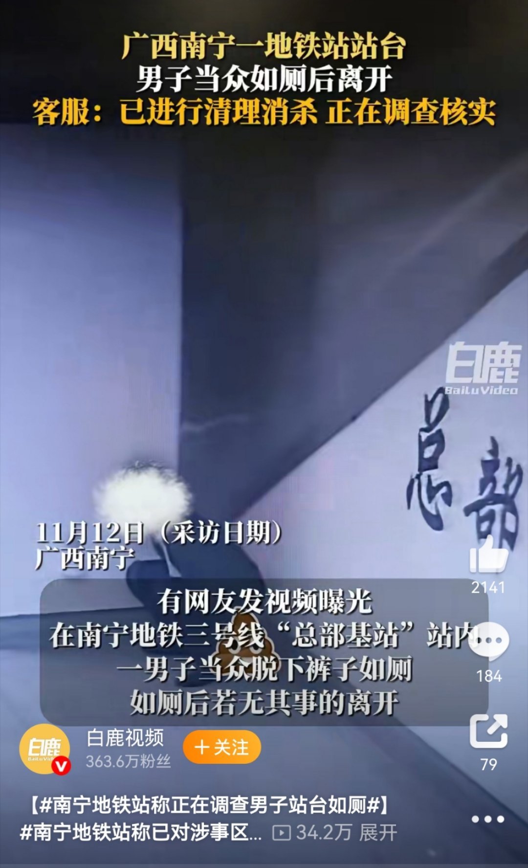 公共场所当守文明,地铁如厕乱象不可容南宁地铁站男子当众如厕的视频令人不适,这种行为无视公共礼仪与规则,严重破坏了地铁公共空间的整洁与秩序,既给其他乘客带来不良体验,也损害了城市文明形象。公共空间的文明,始于每个人的自觉自律。地铁作为城市交通枢纽,是文明素养的“展示窗”,随地便溺不仅违背公序良俗,更涉嫌违反相关管理规定。南宁地铁及时消杀的应对值得认可,但更需通过调查追责形成警示,同时加强公共区域管理与文明引导。守护公共文明,既要靠个体敬畏规则,也需完善约束机制。唯有多方合力,才能杜绝此类不文明行为,让城市公共空间更具温度与秩序。