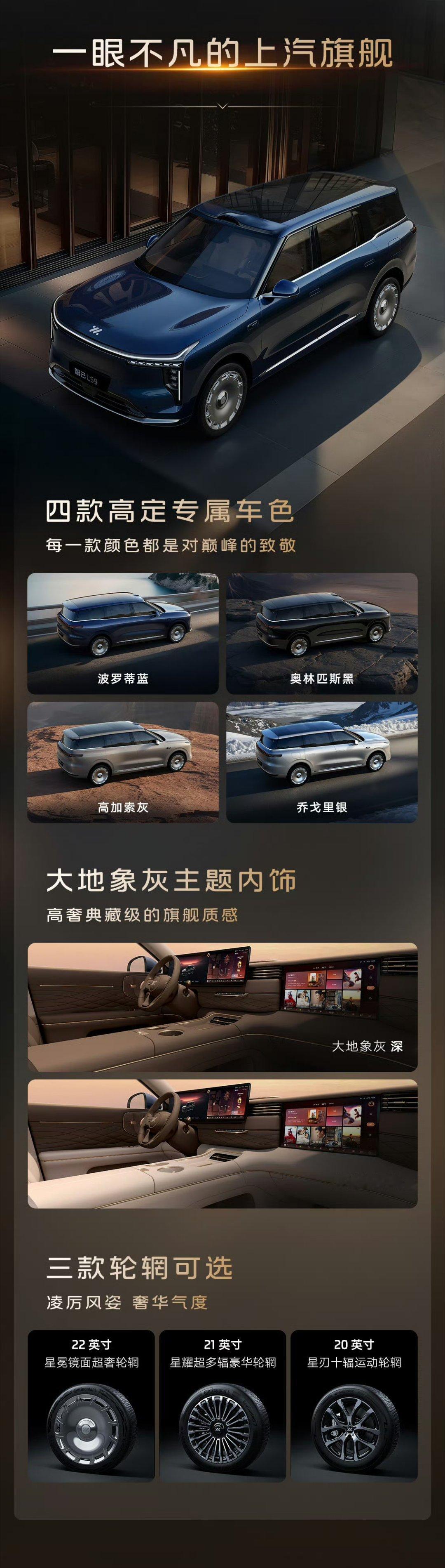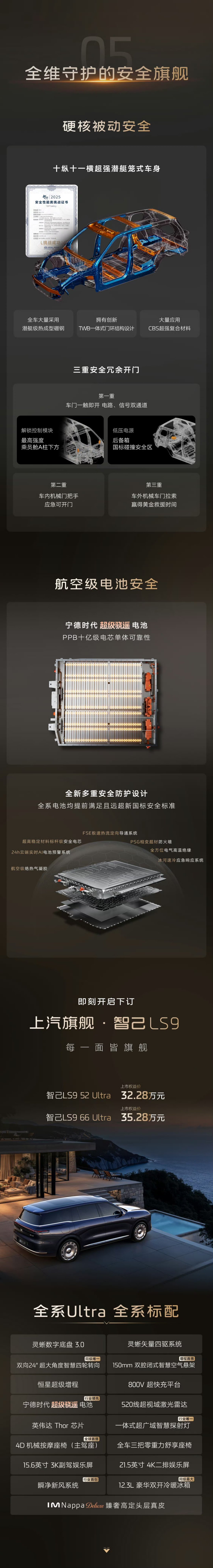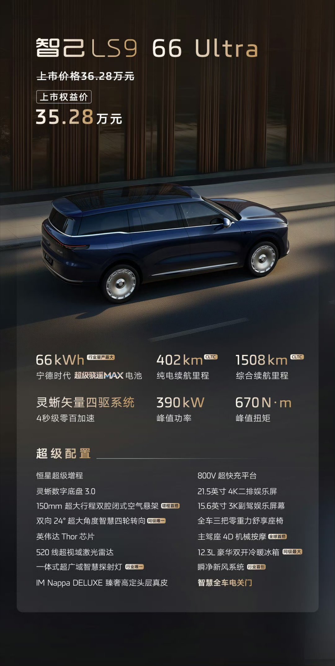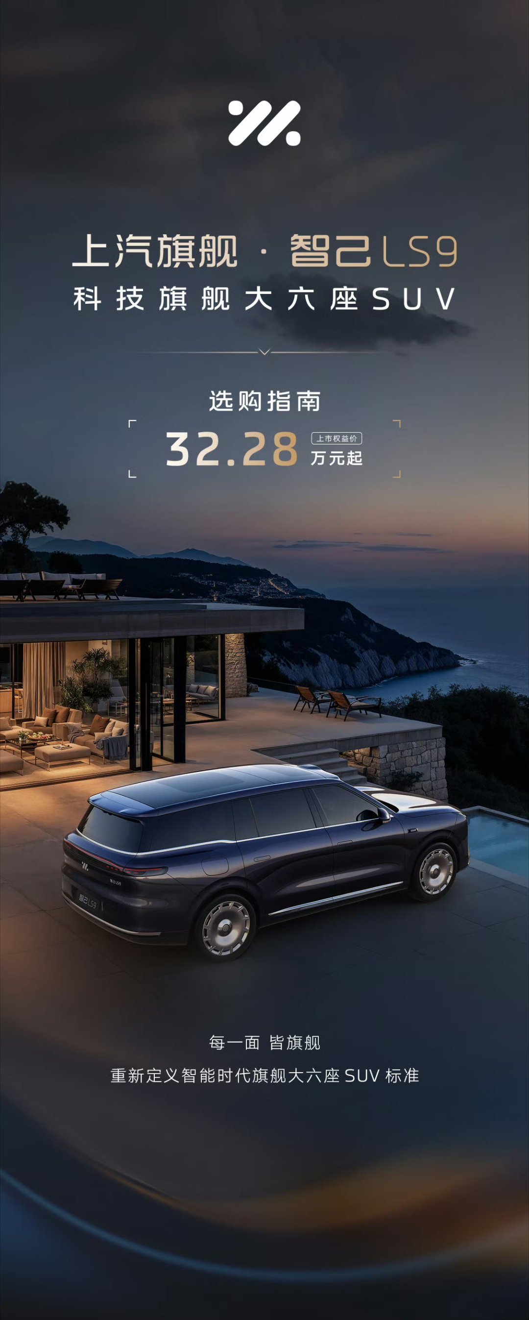 【上市权益价 32.28 万元起、搭载恒星超级增程系统,智己 LS9 大六座 SUV 上市】智己汽车旗下全新六座大型 SUV 智己 LS9 已正式上市,共推出 52 Ultra 和 66 Ultra 两款车型,上市权益价分别为 32.28 万元和 35.28 万元。智己 LS9 整车采用方正的车身造型,大气稳重。其头灯组设计与现款智己车型截然不同,搭配猎鹰智慧灯光系统和前风挡上方的一体式探射灯,科技感十足。车头采用封闭式设计,前包围中央设有进气口,进一步提升了车辆的空气动力学性能。车身侧面,智己 LS9 配备了隐藏式门把手和电动侧踏板,提供 20 英寸、21 英寸和 22 英寸三种尺寸的轮辋可供选择。车辆的长宽高分别为 5279 毫米、2000 毫米和 1806 毫米,轴距 3160 毫米,定位为大型 SUV。车尾部分,智己 LS9 应用贯穿式灯带,两侧尾灯组采用点状布局光源,并支持智慧灯语系统。尾门具备独特的“敲一敲”开关功能,后包围采用隐藏式排气布局。此外,新车提供奥林匹斯黑、高加索灰、波罗蒂蓝、乔戈里银四款外观配色,并可选装拖挂系统和野奢户外套装。智己 LS9 的内饰设计延续了新款智己 LS6 的整体布局,提供大地象灰深色和浅色两种内饰选择,车门处装饰有木纹饰板,营造出豪华的驾乘氛围。车内配备 27.1 英寸驾舱屏、15.6 英寸副驾娱乐屏和 21.5 英寸二排娱乐屏,搭载 IM AIOS 智能座舱系统及高通骁龙 SA8295P 芯片,支持多音区自然语音交互以及苹果 CarPlay、华为 HiCar 等多种手机互联功能。智能驾驶方面,智己 LS9 全系标配 520 线超视域激光雷达和英伟达 Thor 芯片,搭载 Momenta 赋能的 IM AD Max 辅助驾驶系统,提供 ACC 全速自适应巡航、ILC 自动避让、AEB 高速域全场景自动紧急制动等多项基础功能。用户还可选装辅助驾驶全功能包,升级城市领航辅助、高速高架领航辅助等功能。车内采用 2+2+2 的六座布局,前排座椅标配电动调节、记忆、加热、通风和按摩功能,副驾座椅靠背内侧配备老板键,副驾及二排座椅均为零重力座椅。第二排座椅还配备腿托、可调节扶手以及控制通风、加热和按摩功能的按键,右侧设有小桌板,前排座椅靠背可完全放平,与后排座椅形成躺椅模式。此外,第三排座椅支持靠背电动调节及加热功能。智己 LS9 还配备了前后隔热天幕、电动遮阳帘、二排侧窗遮阳帘、双层静音玻璃、智能冷暖双用冰箱、柔光化妆镜、氛围灯、风冷手机无线快充面板、三温区空调、21 声学单元音响系统等豪华配置。此外,车辆还提供 YAT 半幅式方向盘选装,以及 IM MAG 磁吸拓展坞,用户可在智己 App 商城购买多种磁吸拓展装备,进一步提升车辆的实用性和个性化。智己 LS9 搭载“恒星”超级增程技术,配备 1.5T 增程器及前后双电机。其中,52 Ultra 和 66 Ultra 车型的系统综合最大功率分别为 380 千瓦和 390 千瓦,峰值扭矩均为 670 牛・米,0-100 公里 / 小时加速时间均为 4.9 秒。此外,智己 LS9 后续还将推出三电机四驱版本。新车采用 800 伏超快充平台,提供 52 千瓦时磷酸铁锂电池和 66 千瓦时三元锂电池两种选择,CLTC 纯电续航里程分别为 320 公里和 402 公里,CLTC 综合续航里程分别为 1454 公里和 1508 公里。10%-80% 快充时间分别为 19 分钟和 16.5 分钟。智己 LS9 还标配 150 毫米行程闭式双腔空气悬架和灵蜥数字底盘 3.0,支持双向 24 度四轮转向、灵蜥爆胎稳定控制、主动防侧倾 3.0、蟹行模式 2.0 等多项先进底盘技术。据官方介绍,智己 LS9 Hyper 车型将于 2026 年第一季度推出。该车型将搭载全线控转向系统和三电机四驱系统,进一步提升车辆的性能和操控表现。