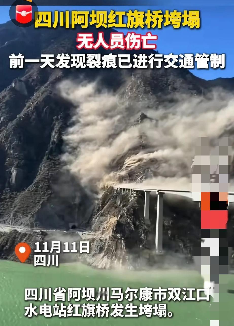 四川阿坝州红旗桥垮塌的视频,看得人心里又沉又复杂!刚用了10个月的“云中之桥”说塌就塌,758米长的大桥坠入河道,多少工人的心血全打了水漂。 有人说大山里搞大工程是浪费钱,人口少没必要折腾,但其实这桥是串联三地的交通关键。真正该琢磨的是,建桥时没预判到边坡滑坡风险吗?好在巡查人员及时发现裂缝,提前管制才没造成人员伤亡,这算是不幸中的万幸。 大山里修桥本就不易,既要考虑交通需求,也得敬畏自然规律。与其纠结“该不该建”,不如追问“怎么建得更稳”,毕竟工程安全才是底线,生态保护也得融入前期规划里。你觉得山区基建该怎么平衡实用、安全和生态?来聊聊你的看法!