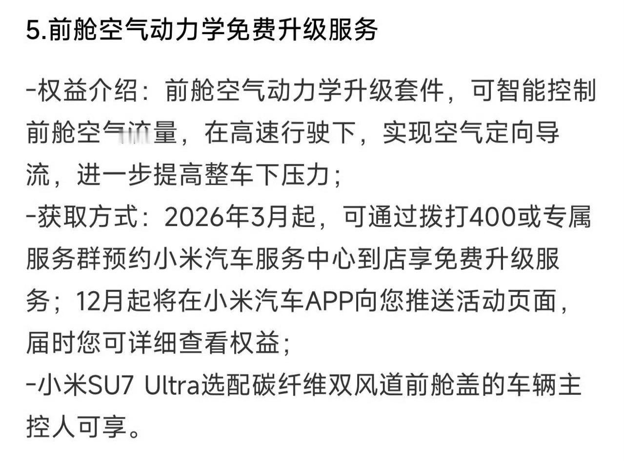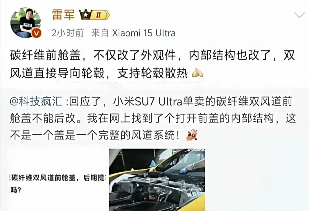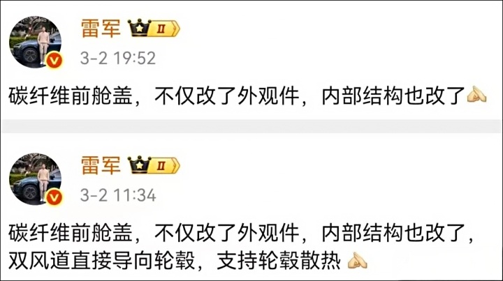 说一下我的看法,因为在某视频平台刷到了很多人在解读这件事,有的人客观一些,有的人则是直接开黑。首先说,关于视频中的管辖权异议以及证据突袭,看了很多律师的解读,这些在法律上是行得通的,否则法院也不会予以支持。其次,这件事其实最早的时候,引发争议的源头在于一个大V发了微博,然后雷军雷总转发了微博,原博说“我在网上找到了个打开前盖的内部结构,这不是一个盖是一个完整的风道系统!”雷总原始转发,描述了“碳纤维前舱盖,不仅改了外观件,内部结构也改了,双风道直接导向轮毂,支持轮毂散热”。后于当天修改了这一描述,去掉了“双风道直接导向轮毂,支持轮毂散热”。这是客观事实,我也看到了被反复提及。倒不如直接说清楚,该条转发(2025/03/02微博)也已经删除。这说明,原始就是转发的某大V的看法,并加以解释。至于这种问题能不能当做证据,肯定是法律为准,无需无端猜测。第三,小米已经公示了“前舱空气动力学免费升级服务”。这是比较完整的脉络,我认为其实目前来说,就是等法院的结果,一切以20日判决为准(是否会其他原因调解或者延期未知)。在此期间,因为诉讼细节只有当事人清楚,大可不必带节奏。