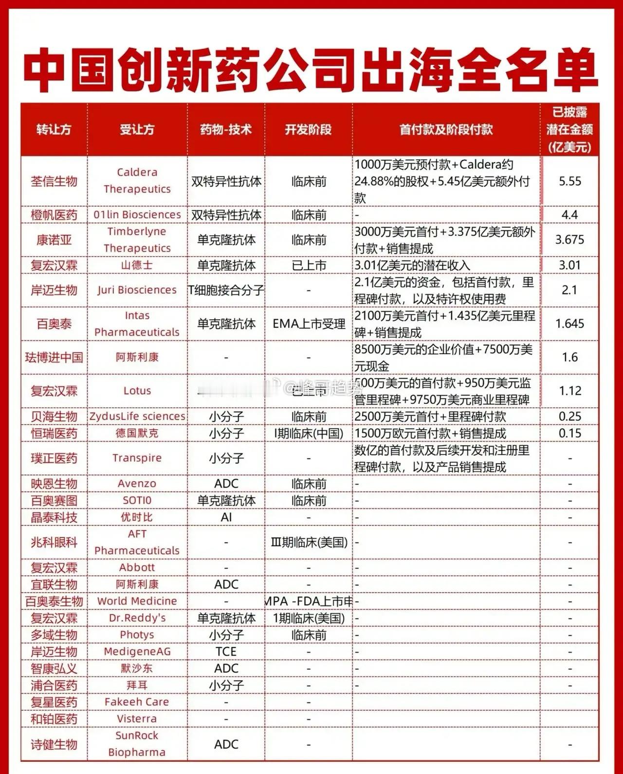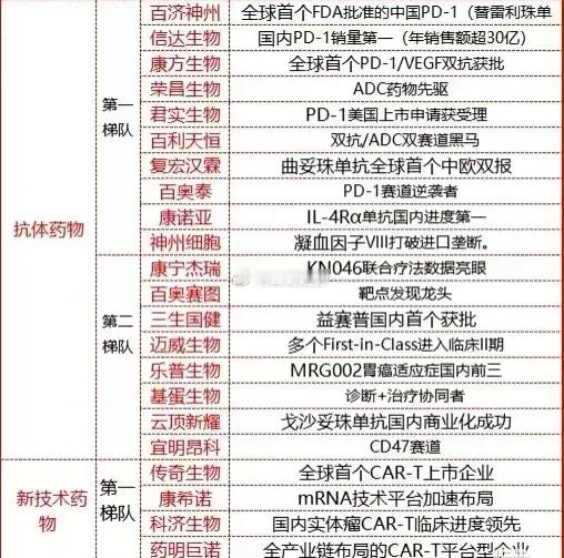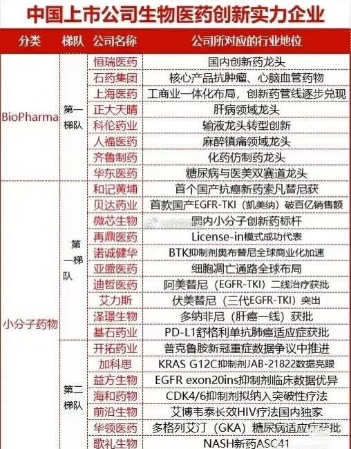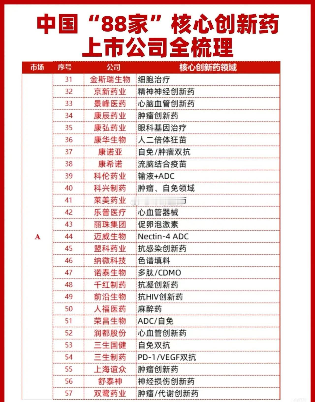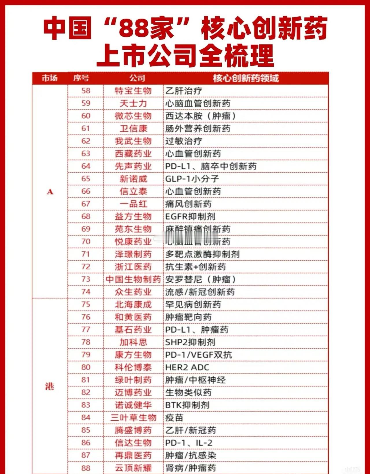 中国创新药核心龙头88强名单出炉!创新药是具有全新化学结构、新靶点或新治疗机制的药物,中国88家核心创新药上市公司全梳理!从细胞治疗、肿瘤新药到疫苗、ADC等前沿领域,既有A股药企深耕细分领域,也有港股公司布局全球创新。都是行业细分领域龙头代表值得关注!中国生物医药创新实力企业梯队划分!第一梯队:恒瑞医药、百济神州等,覆盖肿瘤、自免、ADC等热门赛道;第二梯队:前沿生物、乐普生物等等也在细分领域冲刺突破。(具体龙头名单见配图,资料取材网络仅供参考)这些企业从靶点创新到商业化布局,撑起了中国创新药的“硬实力”版图。理财有风险投资需谨慎!