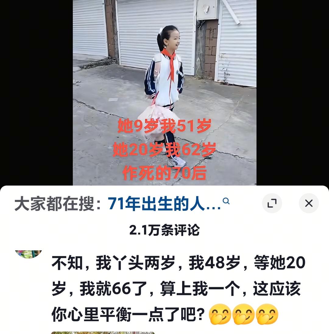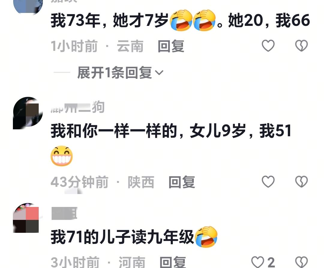 跨越时光的母女情:她9岁,我51岁;她20岁,我62岁。 这些都是70后晚婚的结果,应该也是最难娶老婆的那批70后,这也是他(她)们最无奈的。 我有个80后朋友,今年他40岁,3个小孩,大的21,老二19,老三16! 他在微信朋友圈⭕说,我未老,你已大,看出来我的朋友很🈵足当下现状! 想结婚的要趁早, 不想结婚的想结婚又想做丁克一族的,可以划走! 不想当自己60岁了,小孩才10岁的人。 建设还是早点完成人生大事,如果特晚婚,当自己六七八十岁了,小孩还在读小学读初中时,绝对后悔当初为啥不早结婚!