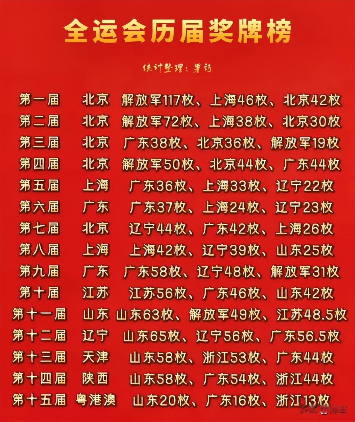 历届全运会举办地及奖牌榜排名。 第一届开始到第四届都是在北京举行,这四界里,解放军有三届拿了奖牌榜第一,有一界被广东拿走了。从第五届开始,各省市都是每四年举办一次,除了北京,就是广东举办得最多了,而且广东真的是一个体育强国,拿过四次的奖牌榜第一名了,但是还有一次后来居上的,那就是山东省,从第十一届开始到第十四届,已经连续四届稳居奖牌榜第一名。最新一届,第十五届,目前还没有结束,山东省依旧领跑着奖牌榜第一,如果这次全运会结束,作为东道主的广东,不能超越山东,那山东真的是强得可怕。