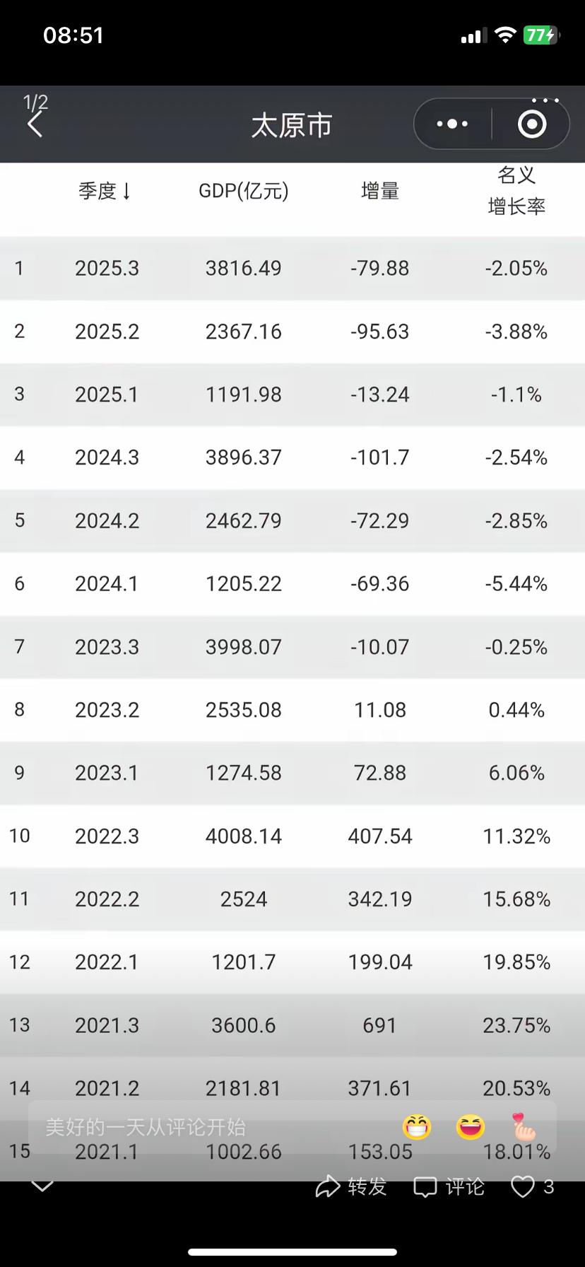 太原GDP终于出来了,作为太原人看了,一种说不出的滋味,不用与周边省会比了,人家贵阳都超太原很多。二十年前,我们老板去了趟贵阳,他说那地方山沟沟,建设比太原差多了,如今太原得抬头看人家了,真是20年河东,20年河西!