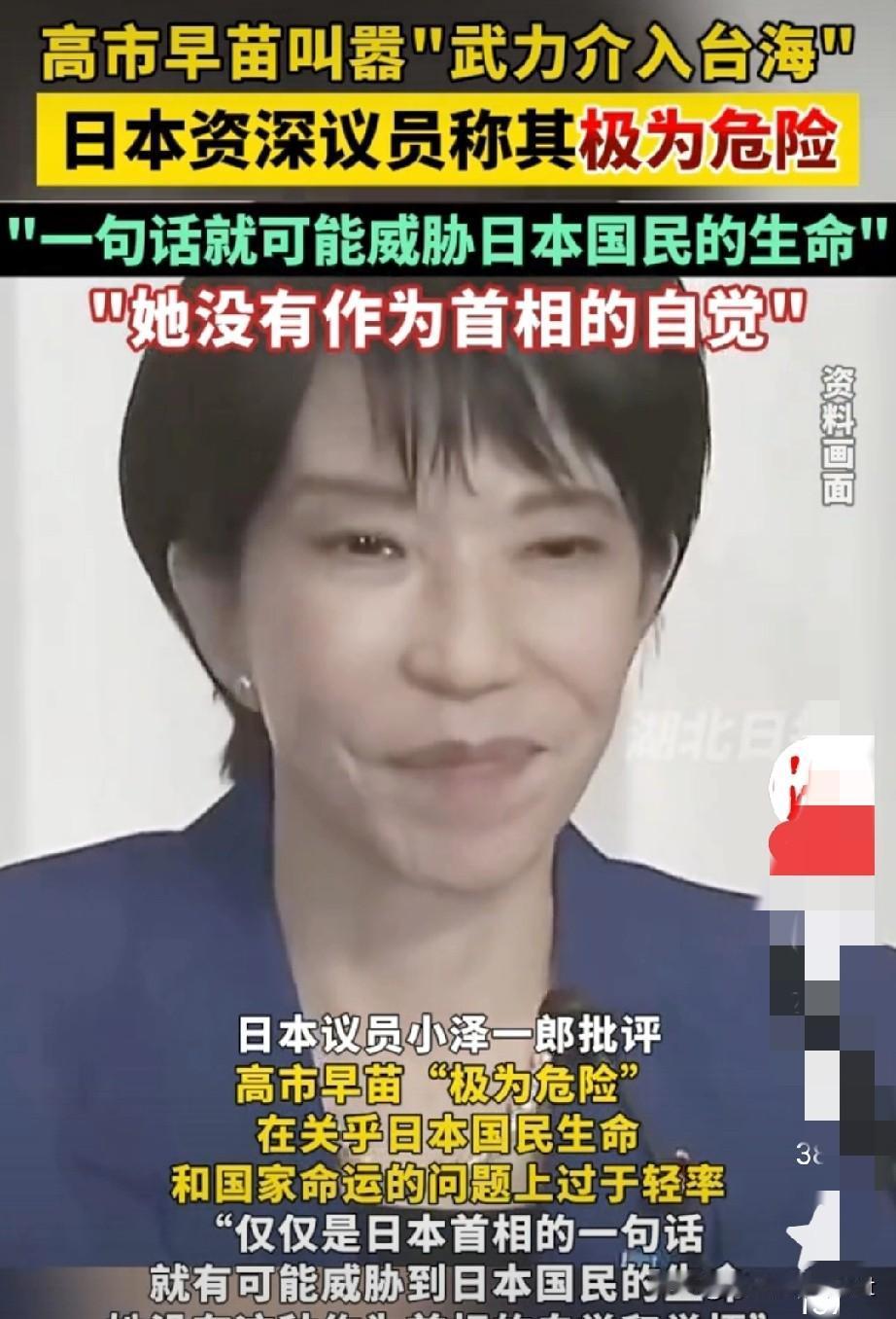 日本政坛炸锅!资深议员痛批首相高市早苗"极为危险",涉台言论闯下大祸 日本首相高市早苗的涉台谬论,不仅激怒中国,连本国政坛都炸了锅!资深议员小泽一郎直接痛斥她"极为危险",根本没有作为首相的自觉,一句话就可能把日本国民推向险境。 这波争议源于高市早苗在国会的狂妄发言:宣称中国大陆若对台使用武力,可能构成日本的"存亡危机事态",自卫队可动用集体自卫权介入。这番话直接违背1972年《中日联合声明》,公然干涉中国内政。 更讽刺的是,日本前首相鸠山由纪夫都忍不住发声,强调台湾问题是中国内政,日本绝不应插手。要知道高市早苗本身就是右翼强硬派,多次参拜靖国神社,如今借台海问题炒作"外部威胁",实则是为军事扩张找借口。 台海局势的稳定,容不得任何外部势力玩火。高市早苗的危险言论,只会加剧地区紧张。违背历史承诺、干涉他国内政的行径,注定会遭到全世界爱好和平人士的反对!