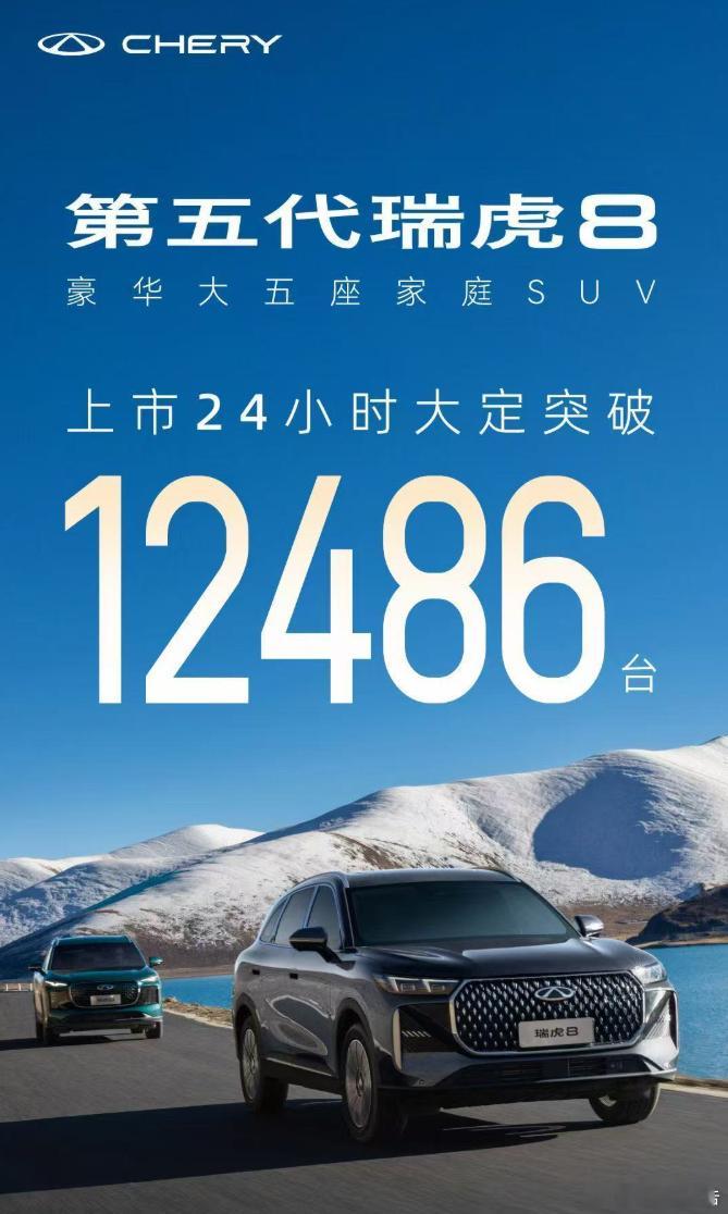 奇瑞瑞虎8上市24小时大定破12486台11月12日,奇瑞汽车宣布,第五代瑞虎8上市24小时大定突破12486台。