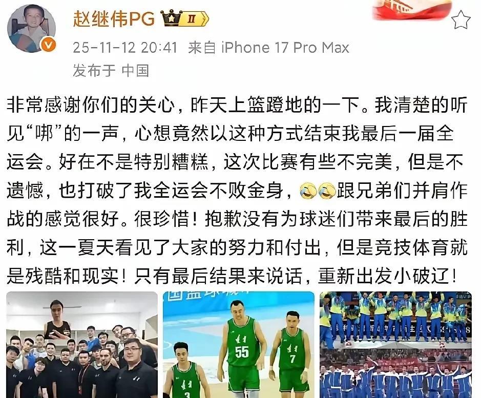 赵继伟透露伤情,晒出自己的四届全运会大合照! 全运会男篮已经落幕,辽宁男篮获得第四名,没有拿到奖牌,赵继伟晒出自己的四届全运会大合照,开玩笑说自己的不败金身被破,这有可能也是赵继伟最后一届全运会!