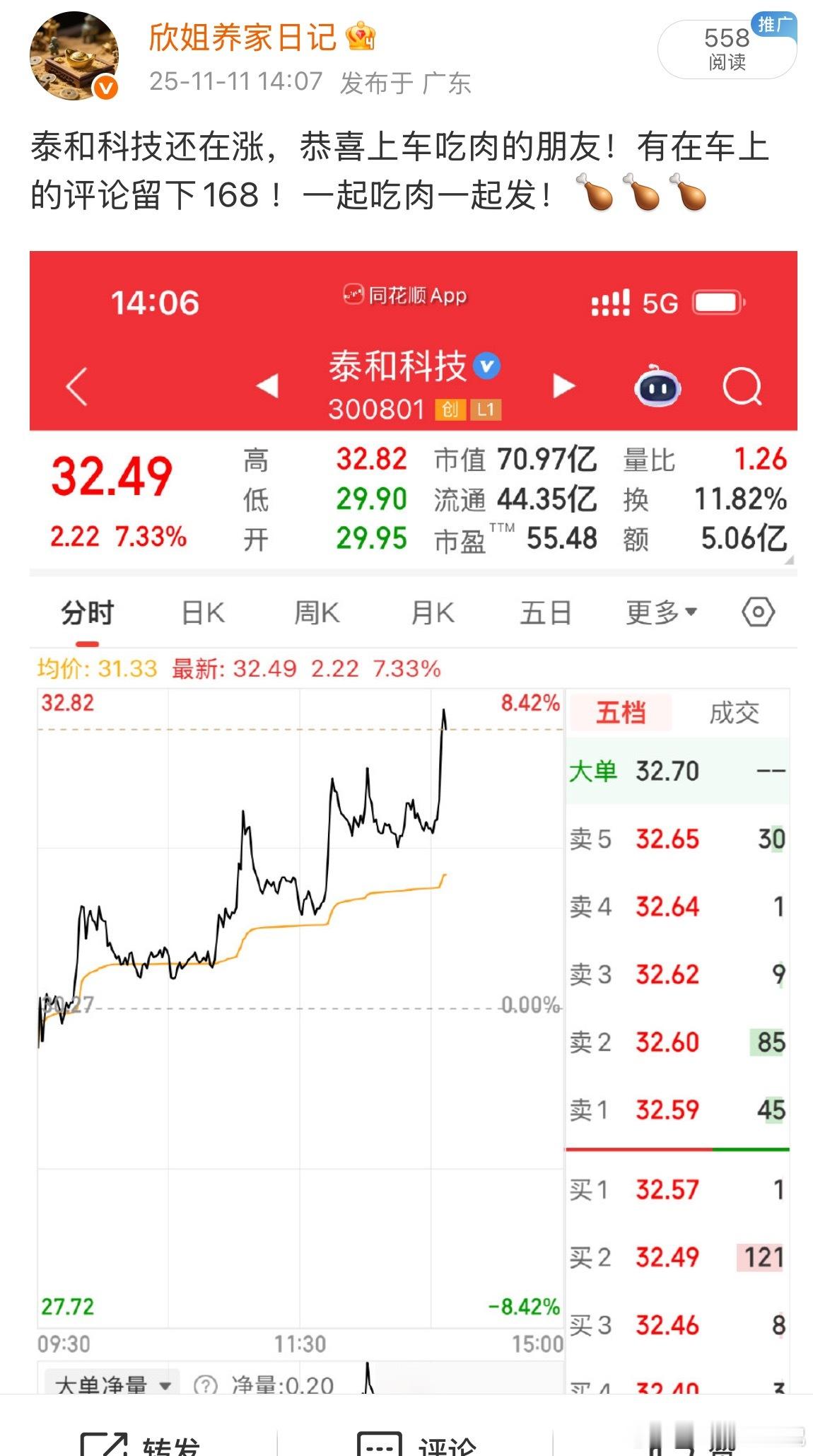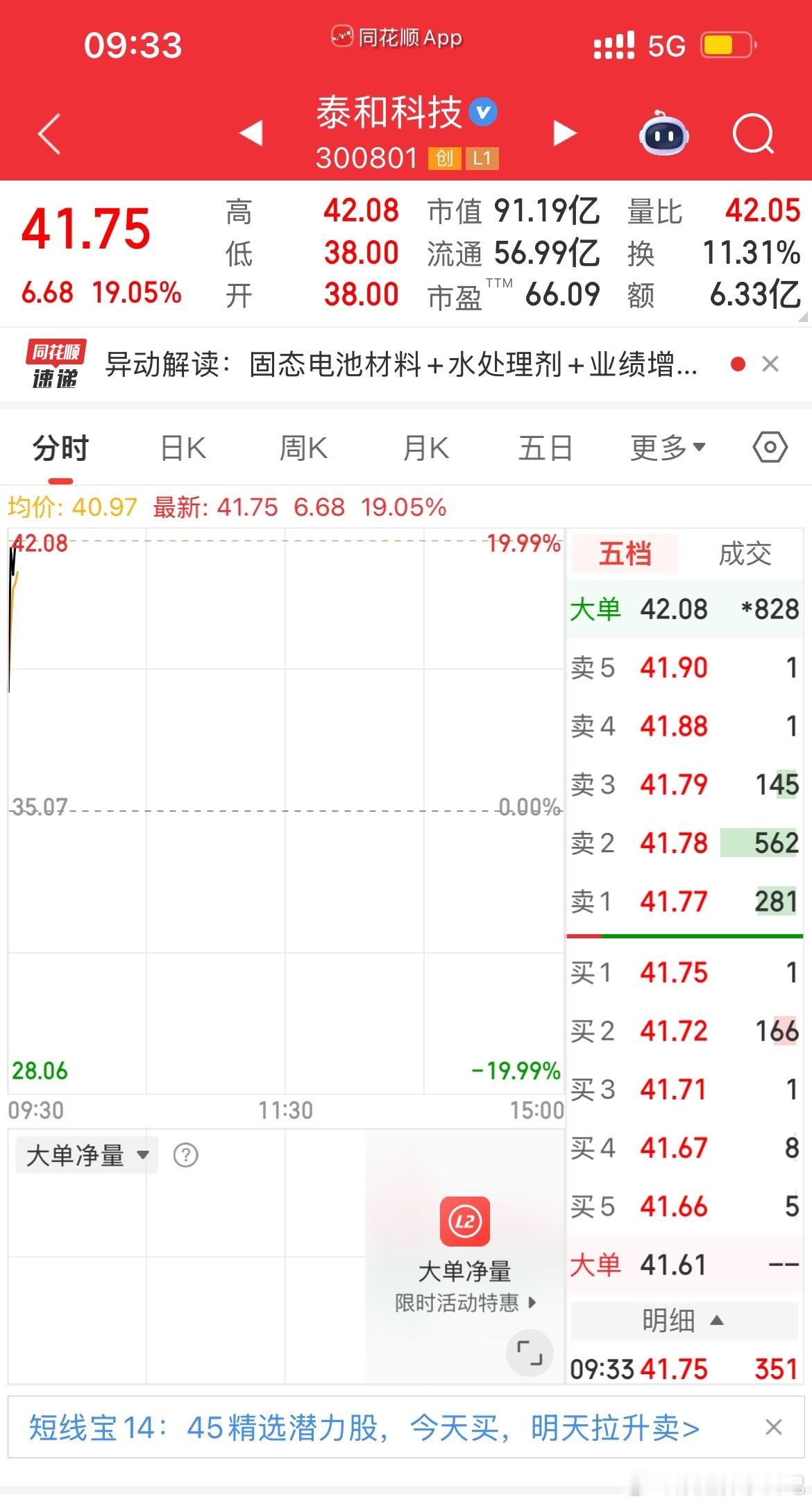 泰和科技开盘收获涨停板 这只票飞掉了 大腿拍断!!
