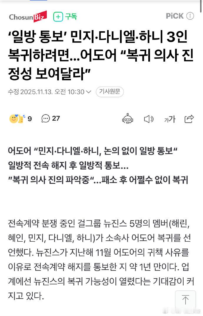 Ador内部是很难马上接受三名成员回归宣言的气氛,如果三名成员的回归讨论不顺利,也可能以Haerin·惠仁New Jeans 2人体制进行活动。
