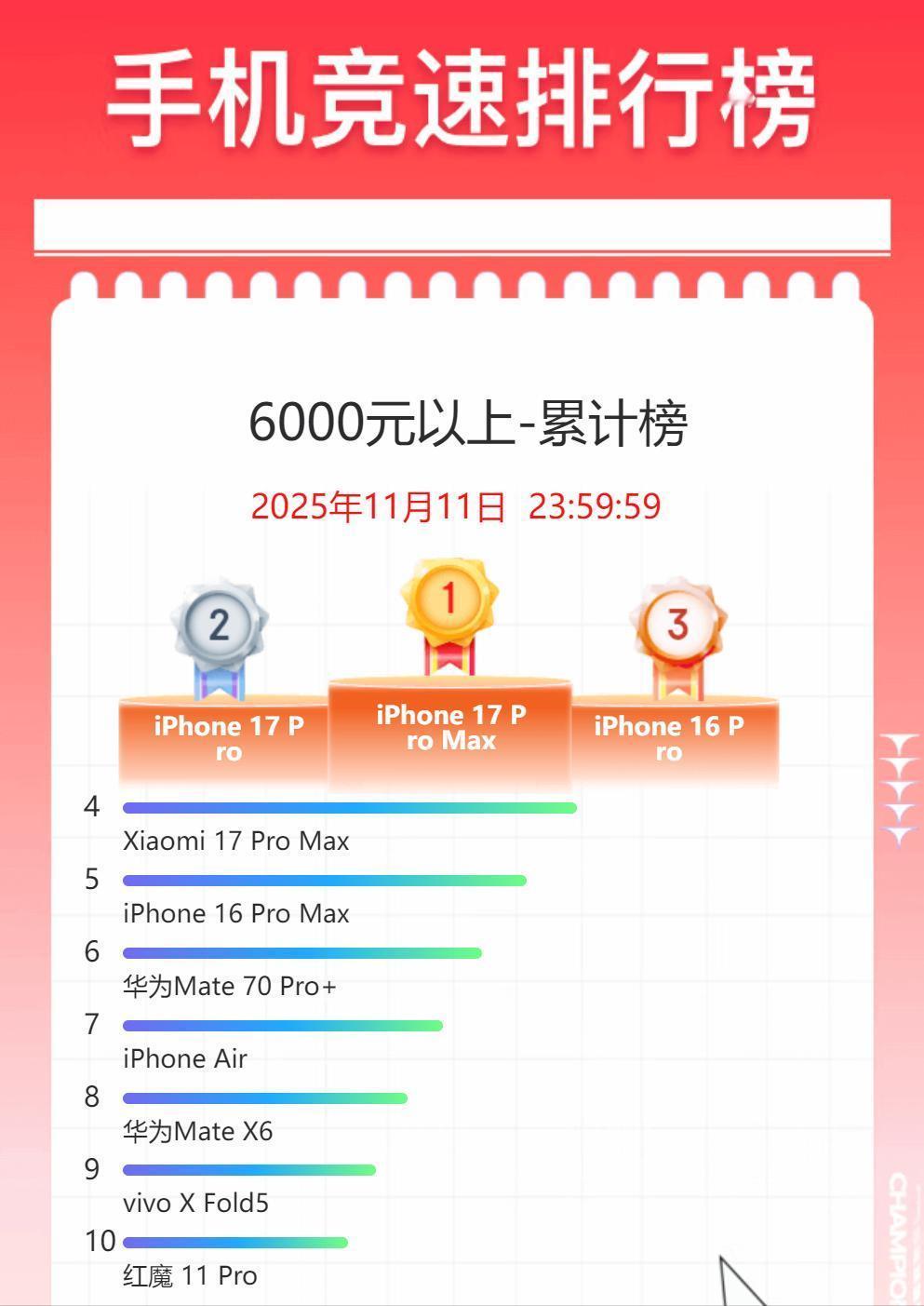 【双十一手机争霸赛落幕!苹果依旧YYDS,小米华为上演逆袭大戏】 吃瓜群众速来围观!今年双十一手机圈战绩出炉,结果让人直呼“刺激”——苹果依旧稳坐灭霸宝座,华为小米却在高端局杀出重围,这波“三足鼎立”的戏码比宫斗剧还精彩! 📱 全价位段霸榜揭秘: • 苹果:销量前十独占五席,iPhone17系列直接包揽冠亚季军!这波操作堪称“外星科技碾压”,国产军团集体沉默…… • 小米:红米K80杀进前四,千元价位带着2K屏和骁龙8Gen3芯片,直接把性价比buff叠满!但Note系列最近画风跑偏,从性能战神转型成“防摔质感大师”,吓得王腾总监直接下课 • 华为:暂未进入全价榜前十,但别急——高端局才是它的主战场! 💎 6000+高端局惊现黑马: • 苹果依旧包揽前三,但小米17 ProMax突然杀出重围,首战就干翻iPhone16 ProMax!雷军的高端梦这次真成了,就是备货太抠门,粉丝天天在直播间“催货警告” • 华为Mate70 Pro+更绝:发布11个月的“老将”依然稳坐第五,这波“吃老本”操作让人直呼内行!要是Mate80提前参战,说不定真能和苹果掰手腕 网友热评: “苹果:在座的各位都是…” “小米这次出息了!就是下次备货能像吹牛那么猛吗?” “华为:等我麒麟满血回归,让你们知道什么叫王者归来” 双十一手机修罗场 苹果还是你大爷