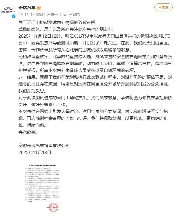 【奇瑞致歉挑战天梯事件,辟谣“月底再来”】日前,奇瑞风云X3L在攀爬天门山999级"天梯"时半途发生溜车,倒退中撞坏景区多个护栏,最终宣布挑战失败。南都·湾财社记者就此发采访函给奇瑞汽车公关部,11月13日凌晨,奇瑞官方正式发布关于天门山挑战测试意外情况的致歉声明。奇瑞表示,此事暴露了他们在策划和执行测试过程中,对潜在风险的预估不足,对细节的把控存在疏漏。特别是对选择在风景区公开场所开展测试引发的公众担忧,他们深刻反思。对于此次测试造成的天门山场地损失深表歉意,承诺将全力修复并承担赔偿责任,做好所有善后工作。奇瑞官方也解释了此次出现意外的原因。奇瑞汽车称,经初步调查核实,此事故的直接原因是,测试装置的安全防护绳固定点卸扣意外脱落,进而导致防护绳缠绕右侧车轮,动力输出受阻,车辆下滑撞击护栏,造成部分护栏受损。据了解,天门山天梯并非普通的台阶,其挑战难度极高,素有“量产车禁区”之称。天梯平均坡度达45°,局部路段甚至超过60°。同时,台阶表面湿滑,且每级台阶的宽度仅有约30厘米,对车辆的轮胎抓地力和动力系统的精准控制,构成了极大的考验。尽管本次挑战受挫,但奇瑞汽车被曝有内部人士透露,该品牌计划在11月25日再次发起挑战。与此同时,针对此次暴露的问题,相关技术团队可能进行一系列的改进措施:换装专为非铺装路面设计的AT轮胎;升级智电四驱系统的扭矩分配算法,以提升后轮锁止的响应速度;增加车身俯仰角实时监测功能,通过主动悬架调整来保持重心稳定。南都·湾财社记者就以上内容向奇瑞汽车求证,得到的回应是“目前未接到这样的消息。”