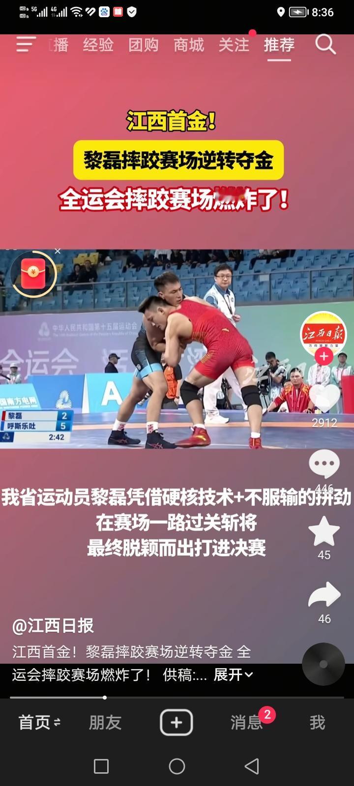 不容易啊,本届全运会江西运动员黎磊终于获得了江西首金,江西人民的心终于放下了,不然好几天了都得不了一块金牌,那太丢人了,还好黎磊很争气。11月12日,在广东清远举办的全运会男子古典式摔跤67公斤级决赛中,江西新余籍选手黎磊对阵甘肃选手呼斯乐吐,他在0∶5落后的情况下逆风翻盘,最终凭后得分优势以5∶5的比分胜出夺冠。这不仅是江西摔跤项目本届全运会的首金,也是全运会开幕式后江西代表团的首枚竞技项目金牌。(图片信息来源:江西日报)全运会 摔跤 首金 江西籍运动员 江西冠军赛