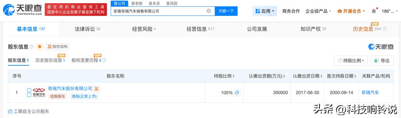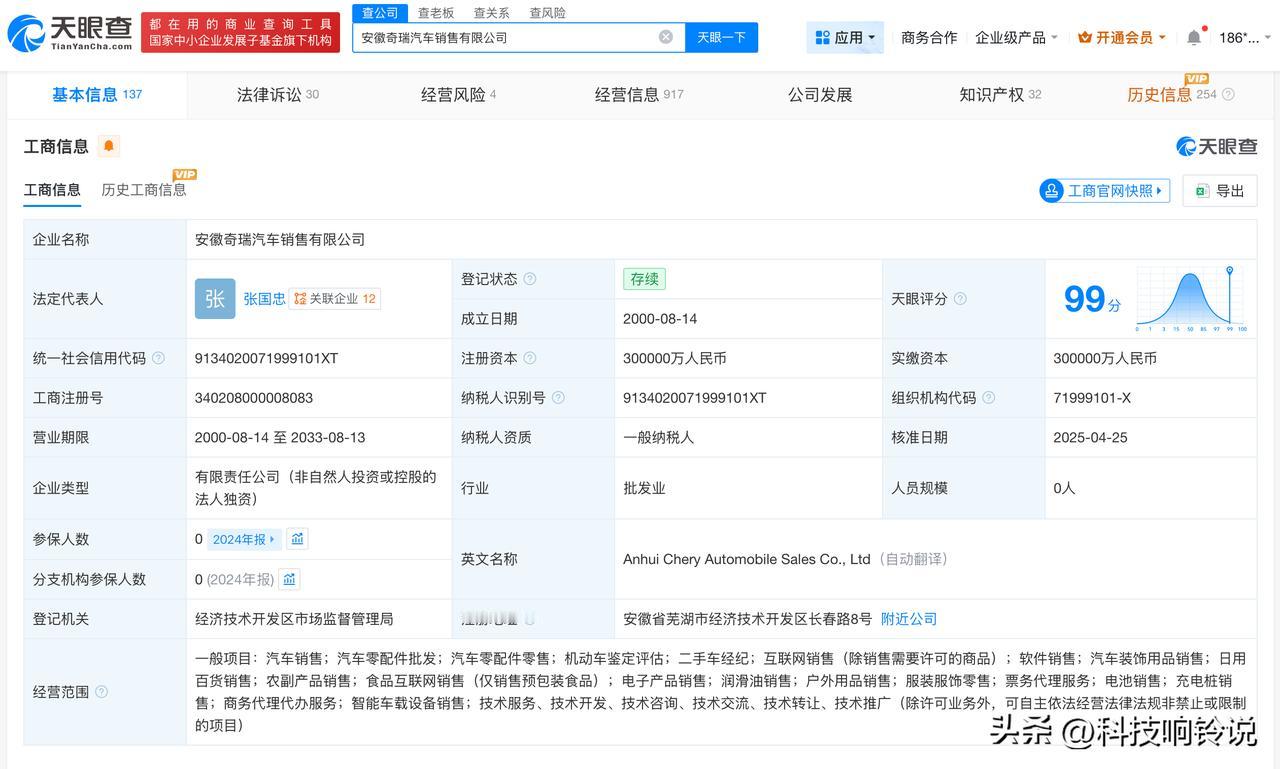 【奇瑞汽车销售公司涉多起纠纷案件 揭秘奇瑞汽车关联公司】奇瑞致歉 11月13日凌晨,奇瑞汽车发布关于天门山挑战测试意外情况的致歉声明。此前,奇瑞汽车在湖南张家界天门山景区进行风云X3L车型的极限挑战测试,测试过程中突发意外,车辆下滑撞击护栏,导致部分护栏损毁,测试中断。 天眼查App显示,奇瑞汽车关联安徽奇瑞汽车销售有限公司成立于2000年8月,法定代表人为张国忠,注册资本30亿人民币,经营范围包括汽车销售、汽车零配件批发、汽车零配件零售等,由奇瑞汽车(09973.HK)全资持股。风险信息显示,该公司涉及多起纠纷案件,案由涉及销售代理合同纠纷、侵害作品信息网络传播权纠纷等。 天眼查信息: