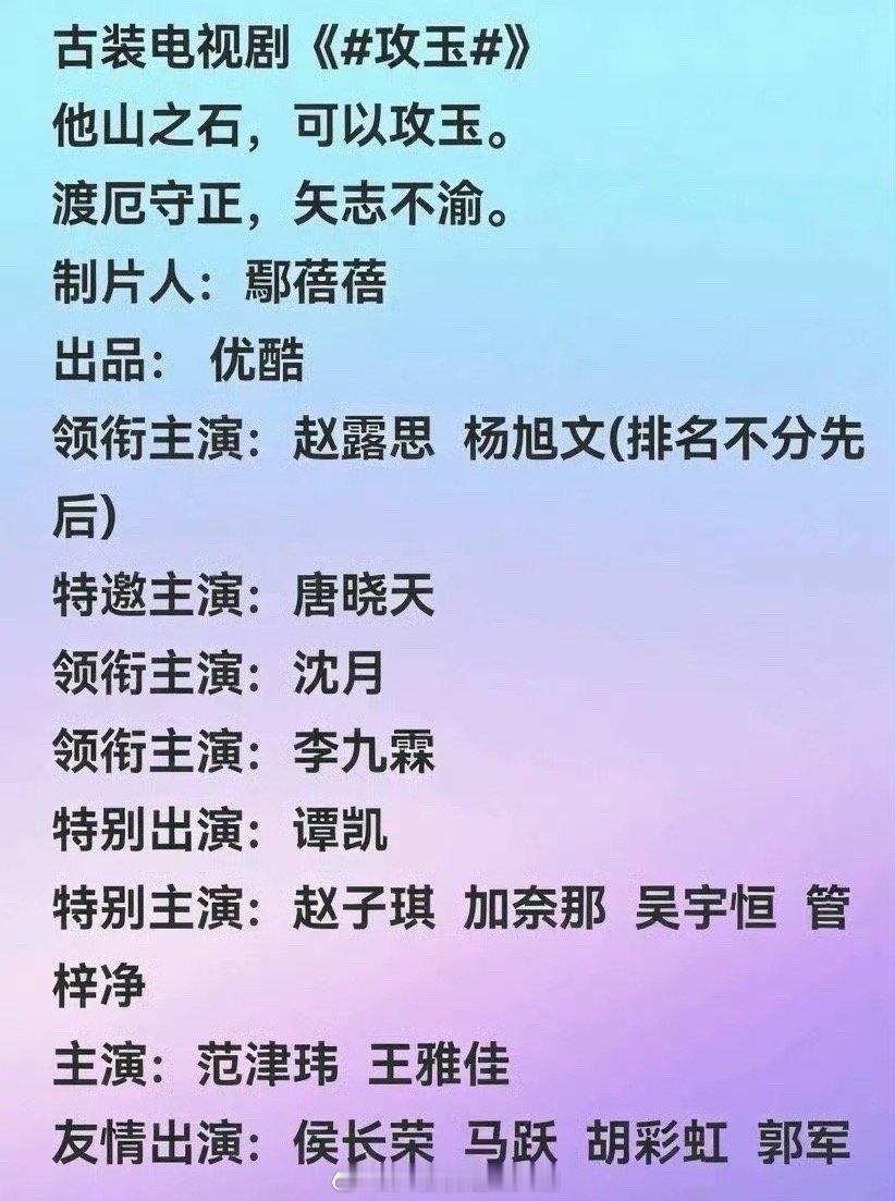 赵露思的新剧《攻玉》男主居然是杨旭文啊,就是说复工就搭档实力派小生,已经开始期待赵露思在剧中的造型了,《攻玉》女主人设很是带感,