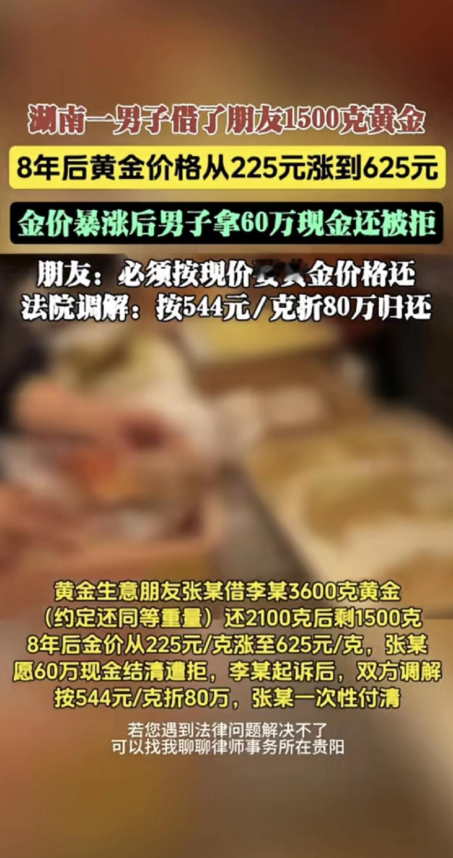 说好借多少黄金就还多少黄金,这事儿本来挺清楚的。 八年前借了1500克黄金,当时金价便宜,现在涨了近三倍,朋友想按当初的价格用现金还,这就不太合适了。既然当初说好“还一样的重量的黄金”,那当然应该按现在的金价折算,或者直接买黄金归还。 虽然法院调解按每克544元赔了80万,但钱和贵重物品还是少借为妙,免得日后伤感情。