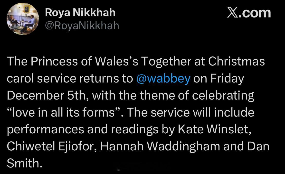 【预告】2025年12月5日,凯瑟琳王储妃再次在伦敦威斯敏斯特大教堂主持圣诞颂歌音乐会🎄今年是她连续第5️⃣年举办圣诞音乐会,主题是“各种各样的爱”。